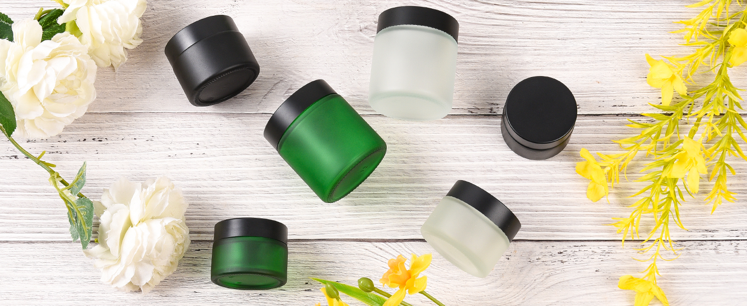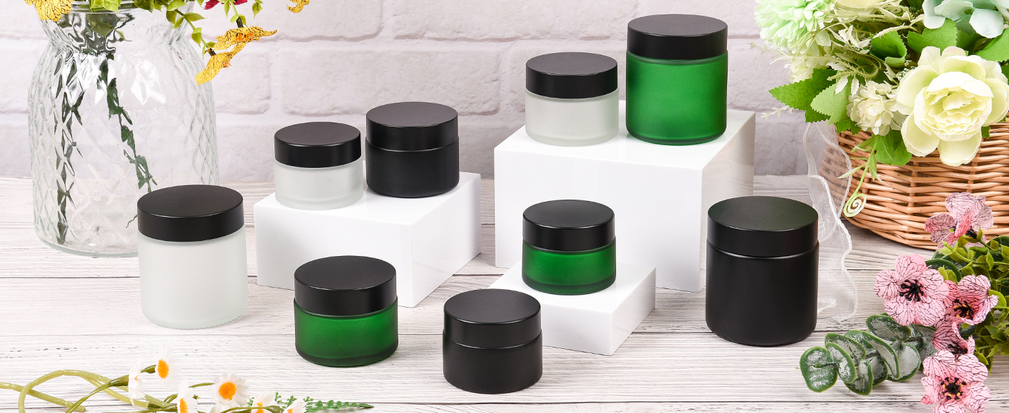 برطمانات زجاجية فاخرة بأغطية محكمة الغلق - مصنوعة من زجاج متين مقاوم للتآكل لحماية الكريمات الحساسة للضوء، مقترنة بأغطية بلاستيكية سوداء لإغلاق محكم، ومنع التسربات والحفاظ على النضارة.