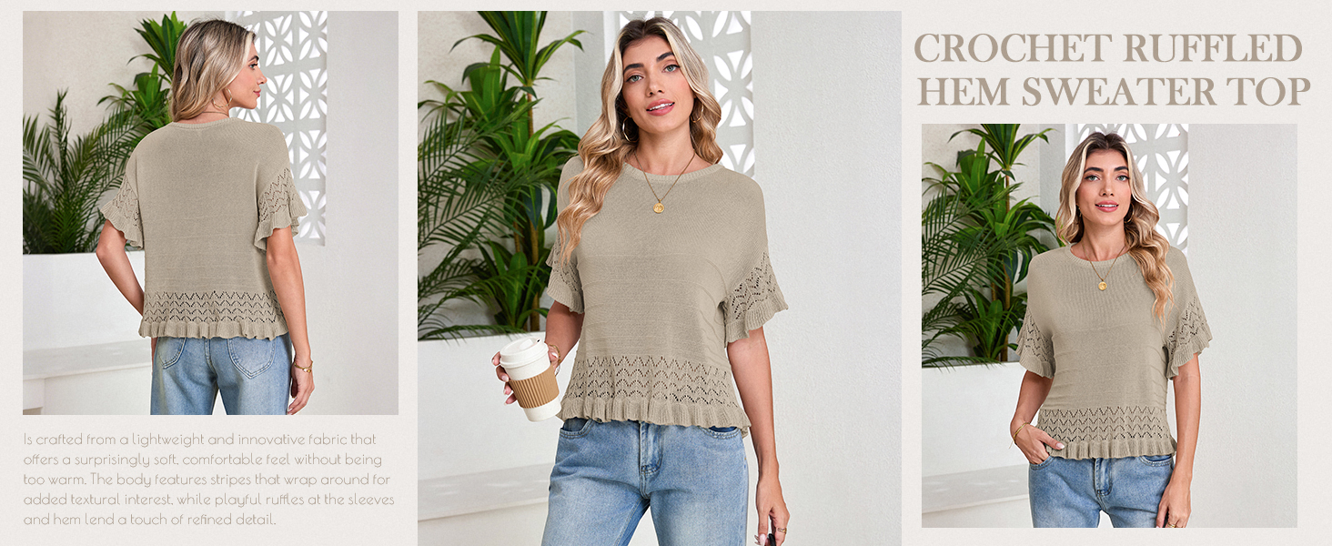 **Office Elegance** Pair this crochet-knit top with tailored trousers or a pencil skirt for a sophisticated office-appropriate look. Its delicate ruffled hem and quiet luxury design add a touch of femininity without being overly casual—perfect for professional settings where comfort and style matter.
