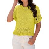 سترة نسائية قصيرة الأكمام من TASAMO سترة منسوجة برقبة دائرية بلوفر كروشيه مع حاشية مكشكشة وبلوزة صيفية مريحة غير رسمية in Kuwait