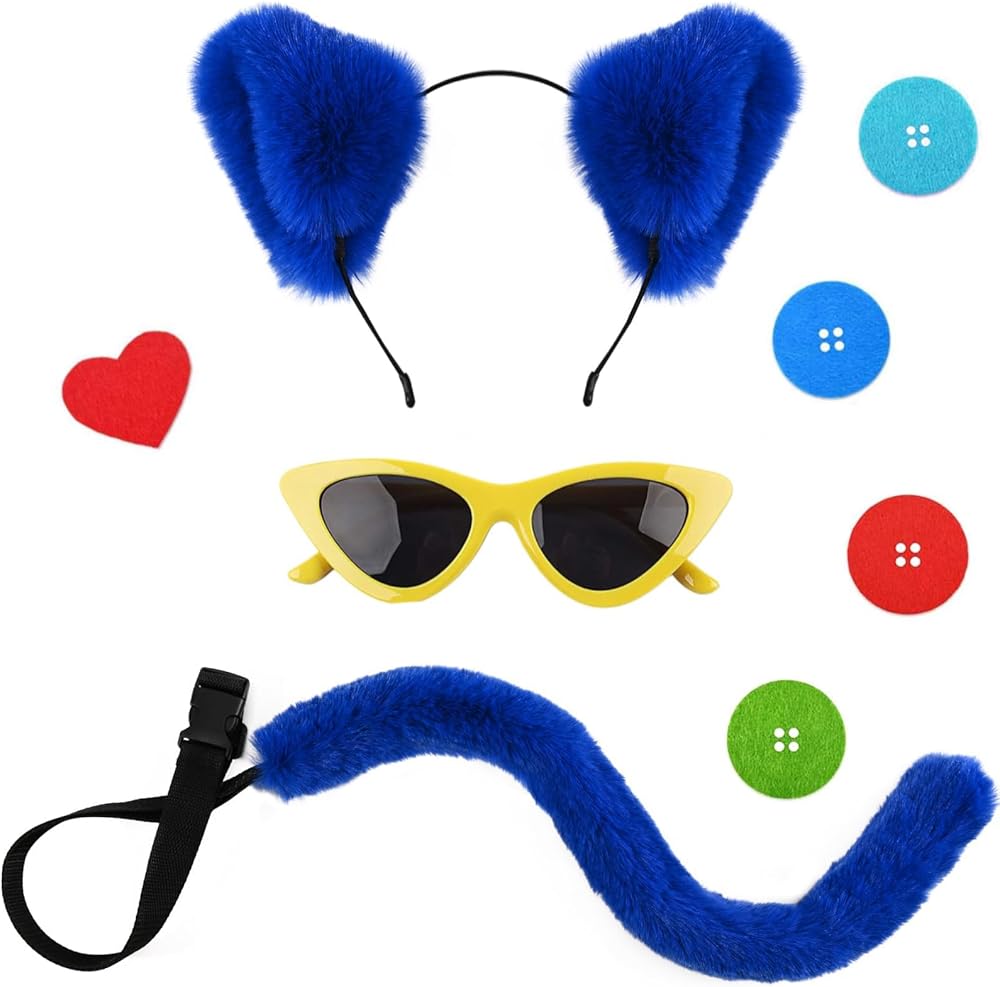 【Great Value Package】This costume set includes all the essentials to become the beloved cat character from storybooks.you will receive 1 piece of blue ears headband,1 piece of yellow cat sunglasses,a furry blue tail and a pastable heart shaped fabric patch,ideal combination for you to wear, you can wear them on various party and it will make you eye catching in the crowd,you can also share them with your friends.