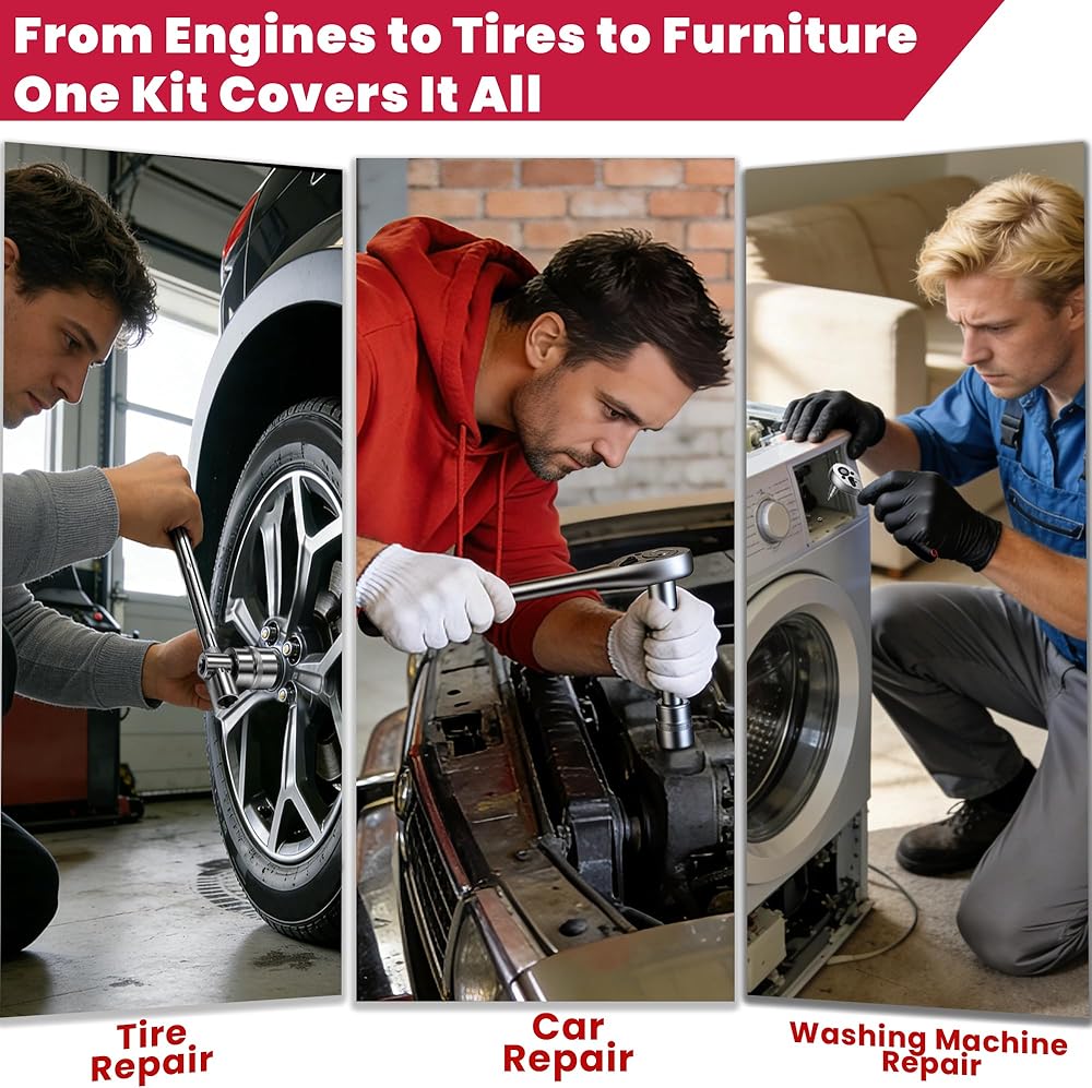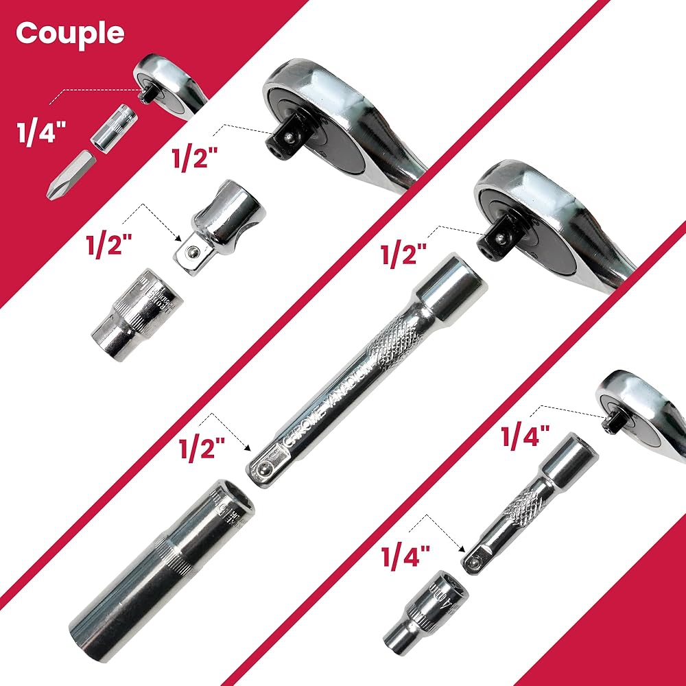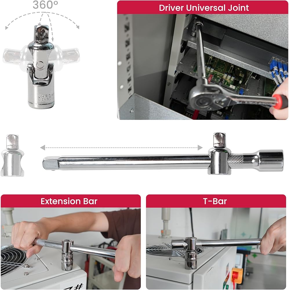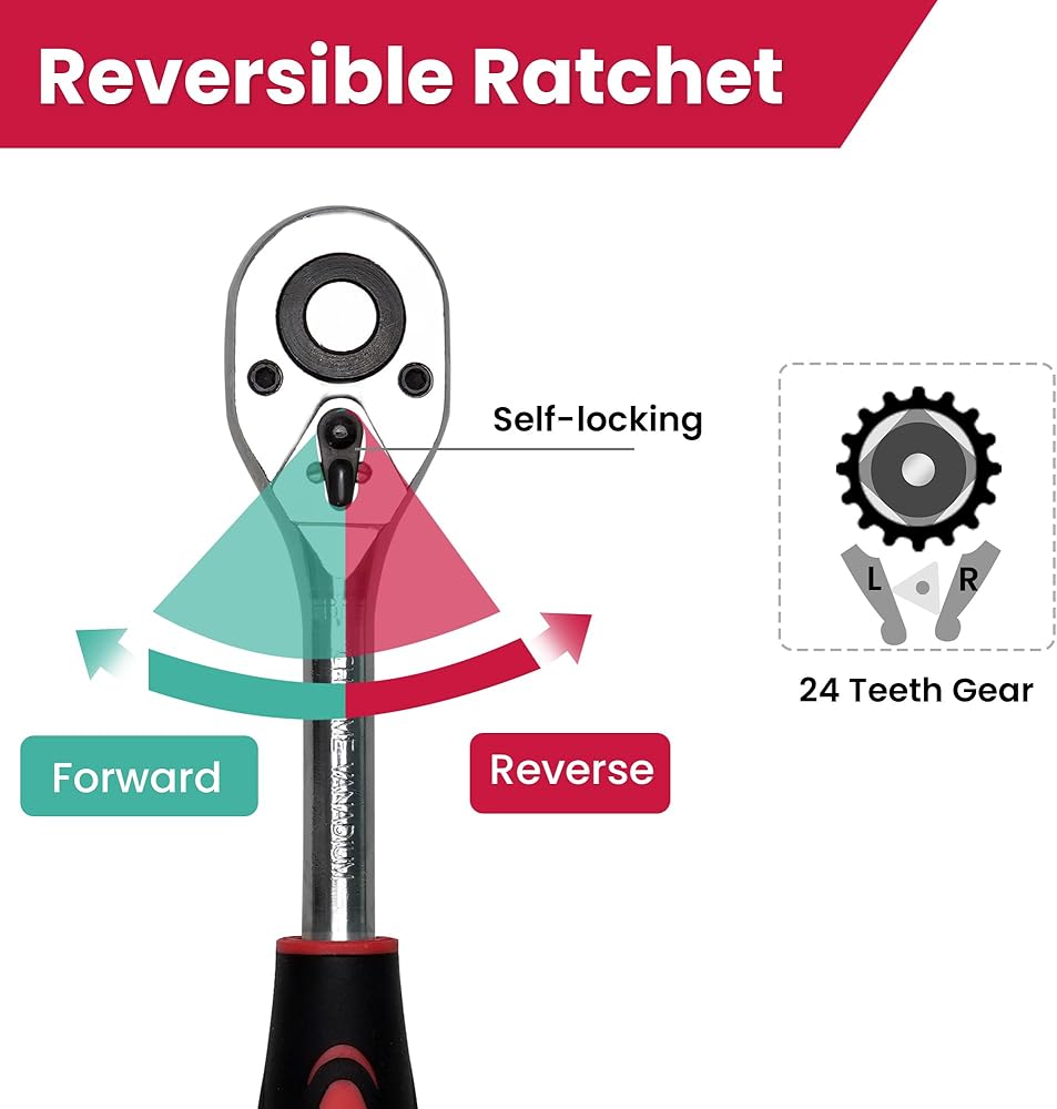 هندسة دقيقة للمساحات الضيقة: تتضمن مجموعة مفاتيح السقاطة ذات 72 سنًا مقابس عميقة وضحلة جنبًا إلى جنب مع مفصل عالمي مرن للوصول إلى فتحات المحرك الضيقة والفجوات الضيقة التي لا يمكن للأدوات القياسية الوصول إليها، مما يمنحك الميزة الميكانيكية لإجراء صيانة عالية الدقة للدراجات النارية وإصلاح المحرك الصغير المعقد دون سلخ مفاصلك أو إتلاف المكونات الحساسة