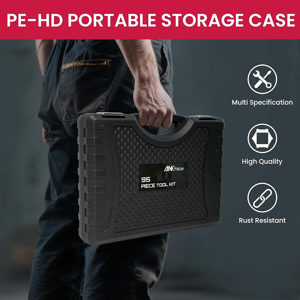 مجموعة أدوات ميكانيكا مترية، 95 قطعة 1/2 بوصة و1/4 بوصة مجموعة مقابس تأثير المحرك مع مقبض سقاطة، مجموعة مقابس عميقة وضحلة مع وصلة عالمية، مجموعة أدوات السيارات مع حقيبة للسيارة والدراجات النارية وإصلاح المنزل
