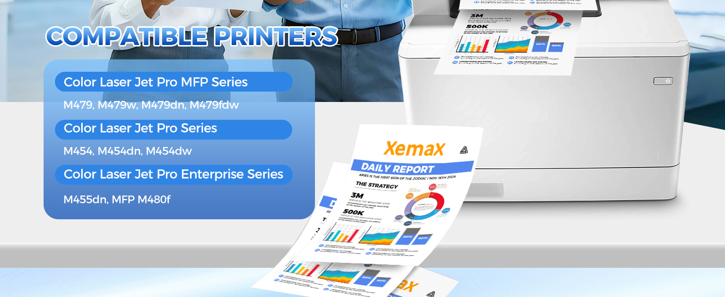 الطابعات المتوافقة: خراطيش حبر 414X 4 عبوات متوافقة مع سلسلة HP Color Laser Jet Pro MFP: طابعات M479، M479w، M479dn، M479fdw، سلسلة Color Laser Jet Pro: طابعات M454، M454dn، M454dw، سلسلة Color Laser Jet Pro Enterprise: طابعات M455dn، MFP M480f
