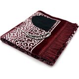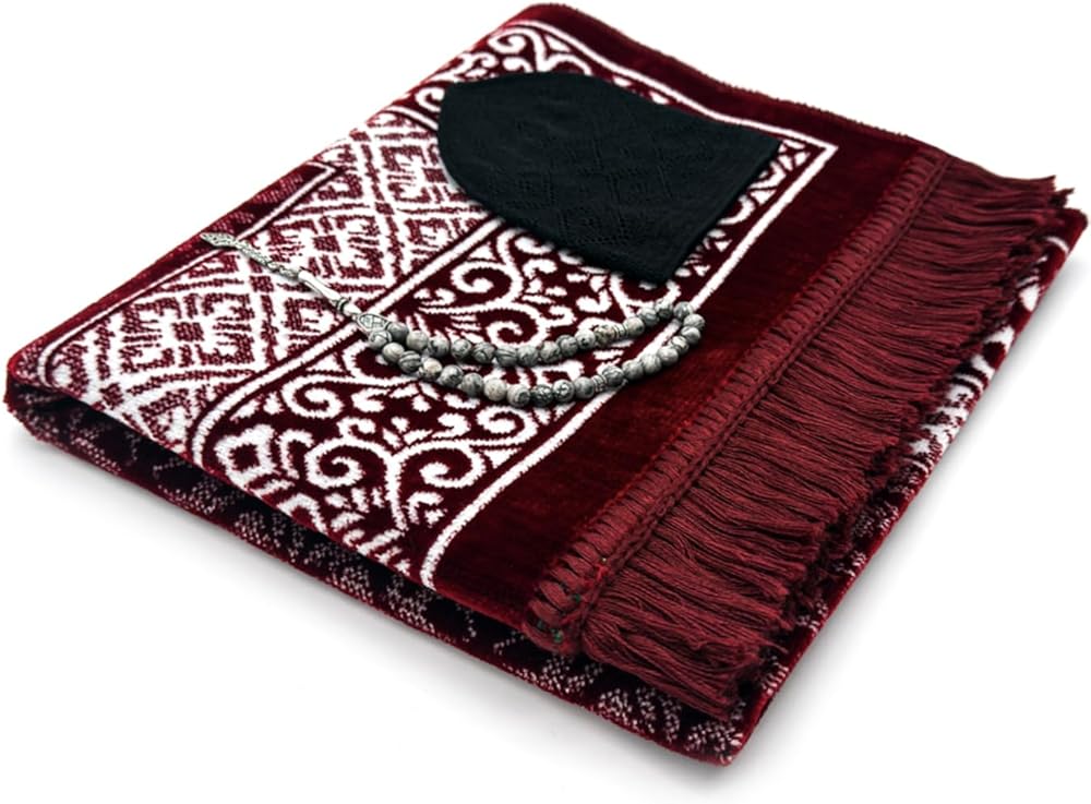 سجادة صلاة مخملية من ESERRA، مجموعة الكل في واحد للإسلام - سجادة صلاة سميكة للمسلمين، قبعة كوفي سوداء، حجر جاسبر 33 خرزة صلاة، حقيبة سفر قطنية - هدايا إسلامية (أحمر)