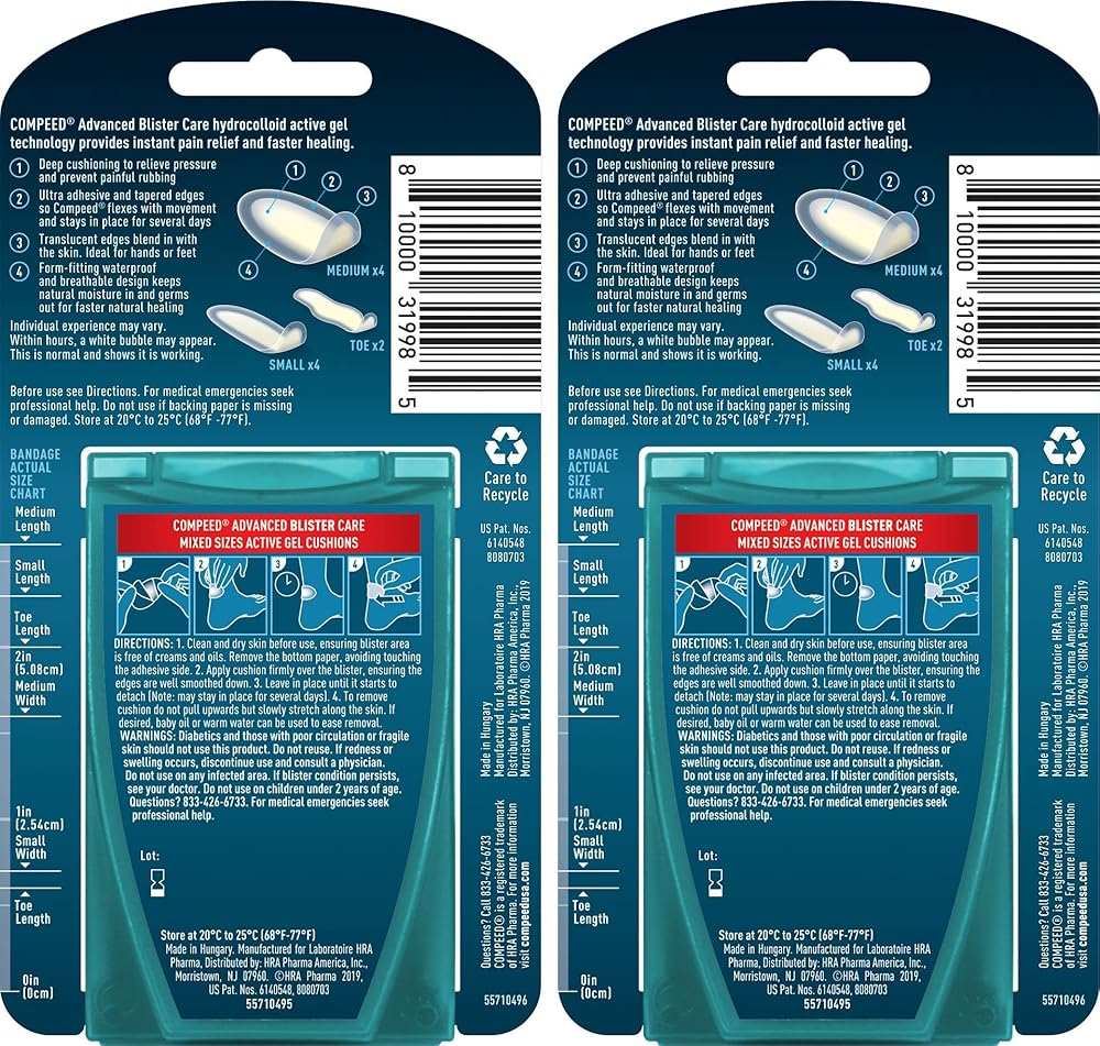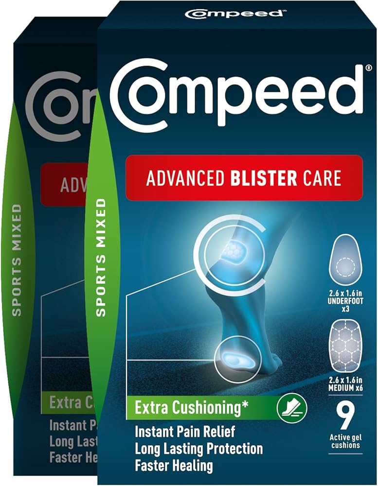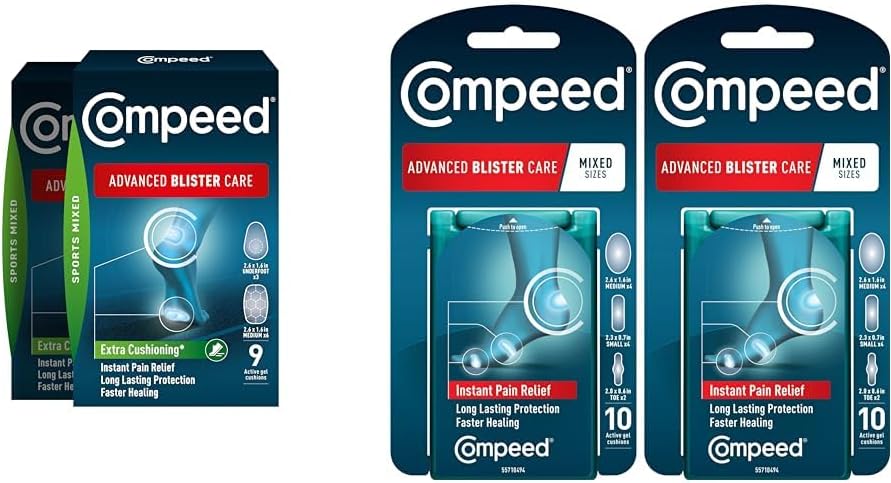 This bundle includes 4 packs of Compeed's advanced blister care hydrocolloid cushions to prevent and treat painful blisters on your feet, heels, and toes. One pack contains 9 mixed sports cushions ideal for high impact activities like running or hiking, with 6 medium honeycomb pads for heels providing 20% extra cushioning and 3 thicker underfoot pads protecting the ball of your foot. The other 2 packs include 10 mixed size regular cushions for blisters anywhere with 4 medium for heels, 4 small for foot sides, and 2 for toes. Compeed's hydrocolloid material helps heal blisters up to 20% faster than ordinary bandages by absorbing fluid and redistributing pressure away from the wound. The cushions act like a second skin to protect blisters from infection while maintaining a moist environment optimal for healing. They conform to the shape of your foot and stay securely in place for multiple days, even during showers or exercise. With superior comfort, instant pain relief, and lasting protection, Compeed cushions create the best conditions for your blisters to heal quickly so you can get back to activity. This bundle offers a variety of cushion shapes and designs to prevent and treat blisters all over your feet.