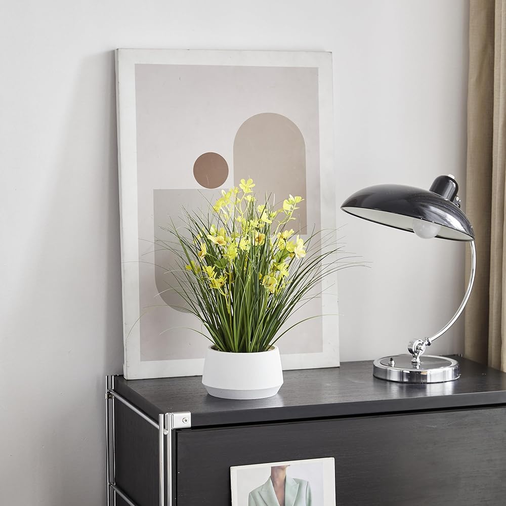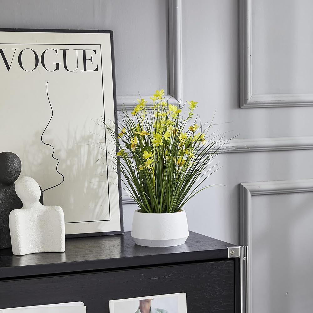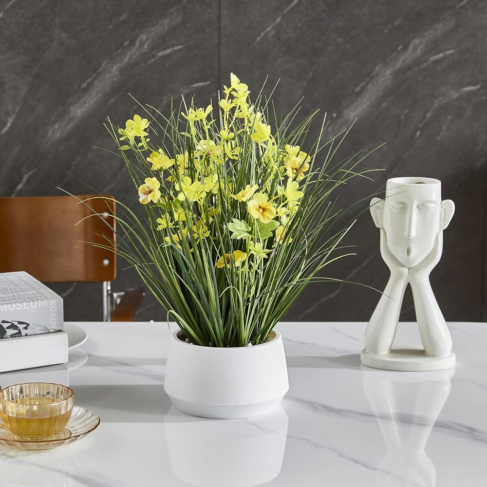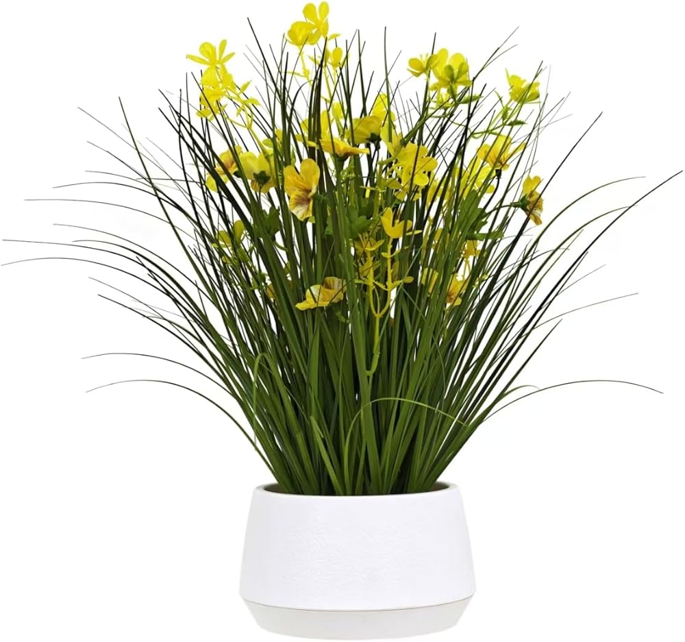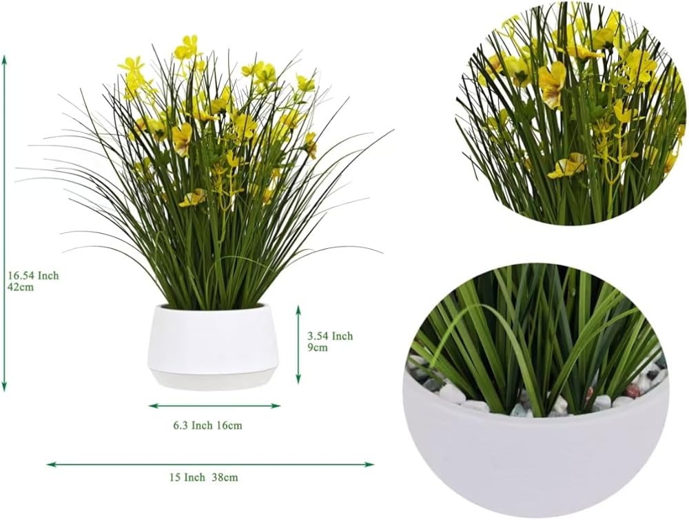 Bring a touch of year-round greenery and cheerful yellow accents to your space with the 365 Blooming Decor 16.5" Artificial Yellow Onion Grass Plant. Designed by Canadian artisans, this faux plant features soft-touch grass blades and delicate yellow flowers that look remarkably realistic. Nestled in a stylish modern pot topped with decorative pebbles, it instantly elevates any tabletop, shelf, or office desk with effortless charm. Unlike real plants, this artificial grass requires no watering, trimming, or sunlight—simply place it and enjoy its beauty. Assembly-free and ready to use, it's an easy way to brighten up your home, office, kitchen, or reception area. Whether you're looking for a low-maintenance accent piece or a thoughtful housewarming gift, this lifelike arrangement delivers natural elegance that lasts season after season.