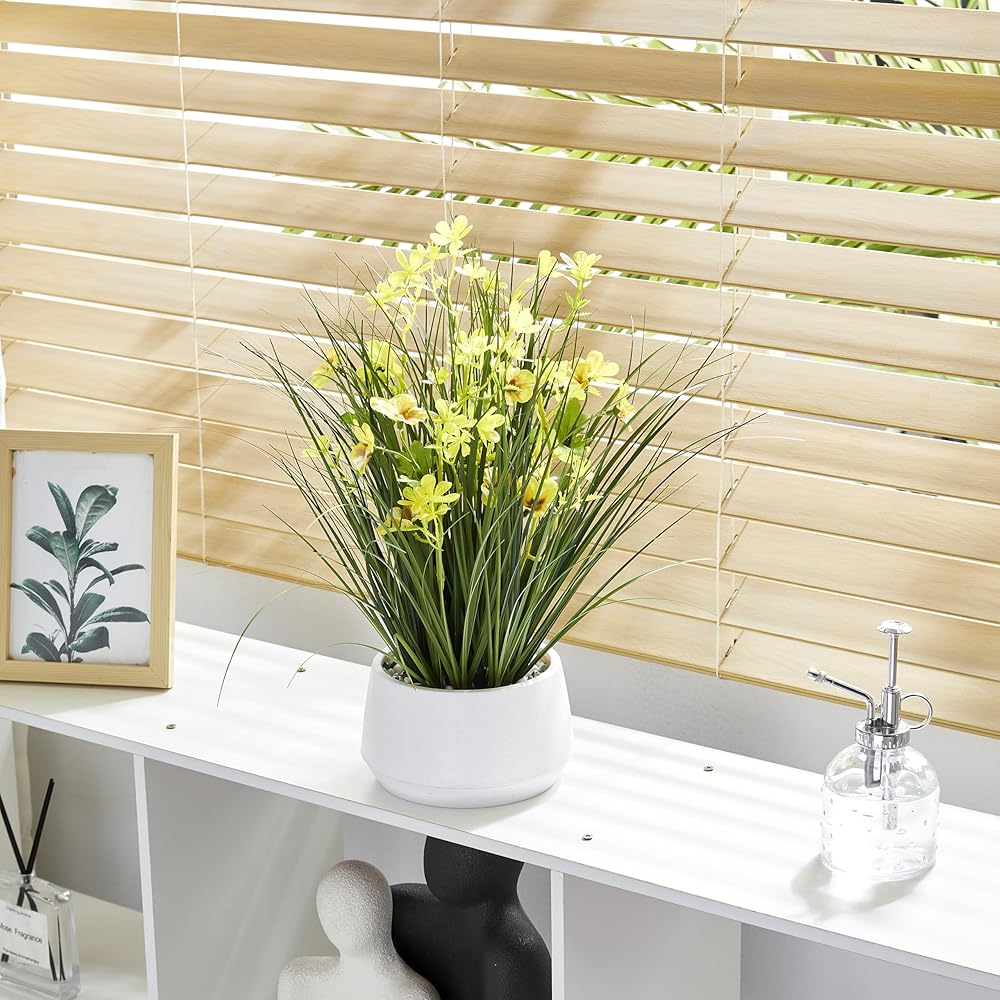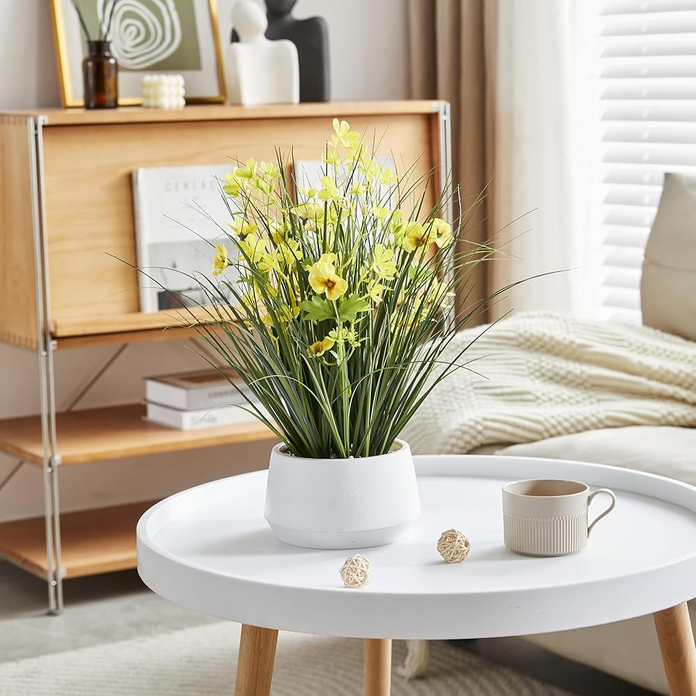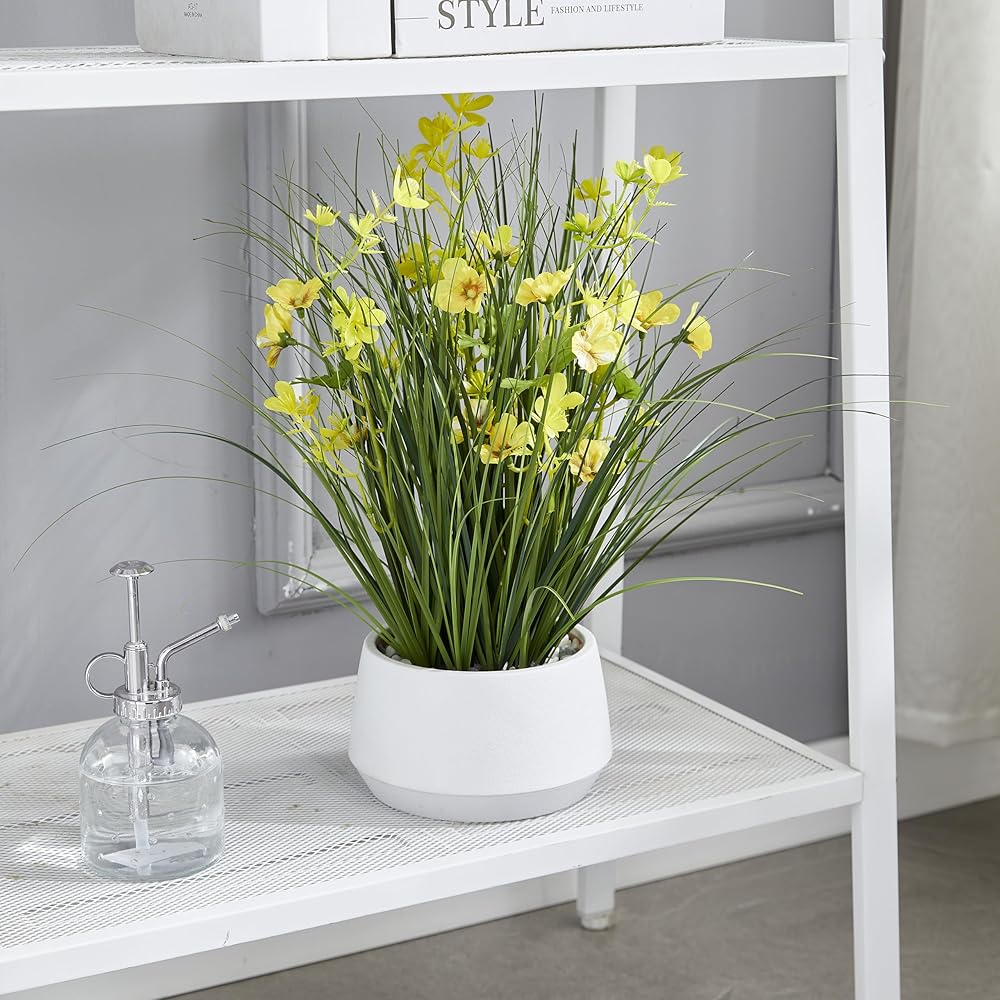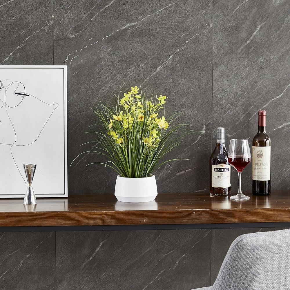 Bring a touch of year-round greenery and cheerful yellow accents to your space with the 365 Blooming Decor 16.5" Artificial Yellow Onion Grass Plant. Designed by Canadian artisans, this faux plant features soft-touch grass blades and delicate yellow flowers that look remarkably realistic. Nestled in a stylish modern pot topped with decorative pebbles, it instantly elevates any tabletop, shelf, or office desk with effortless charm. Unlike real plants, this artificial grass requires no watering, trimming, or sunlight—simply place it and enjoy its beauty. Assembly-free and ready to use, it's an easy way to brighten up your home, office, kitchen, or reception area. Whether you're looking for a low-maintenance accent piece or a thoughtful housewarming gift, this lifelike arrangement delivers natural elegance that lasts season after season.