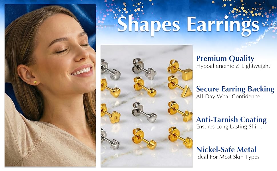 أقراط كافلون مطلية بالذهب عيار 24 قيراط / ستانلس ستيل بأشكال متنوعة 4 ملم | مجوهرات أذن آمنة من النيكل ولا تسبب الحساسية | أشكال مختلطة مع ظهر فراشة آمن | ترصيع ثقب فضي مصقول | حزمة من 12