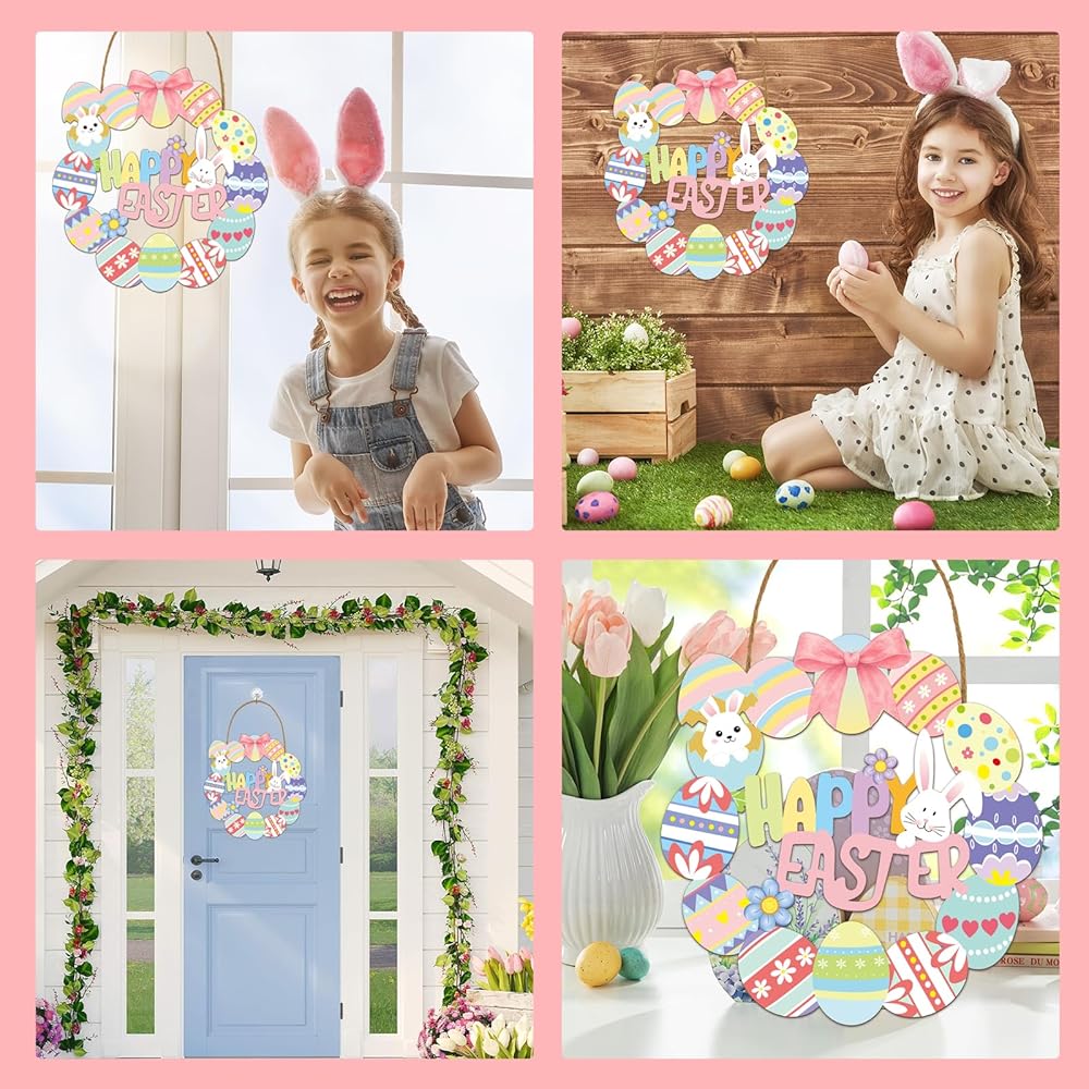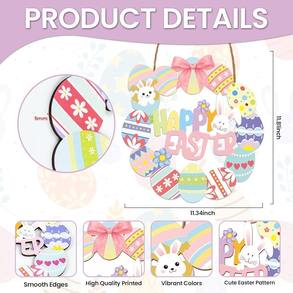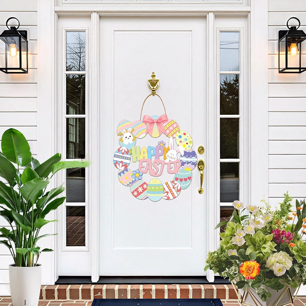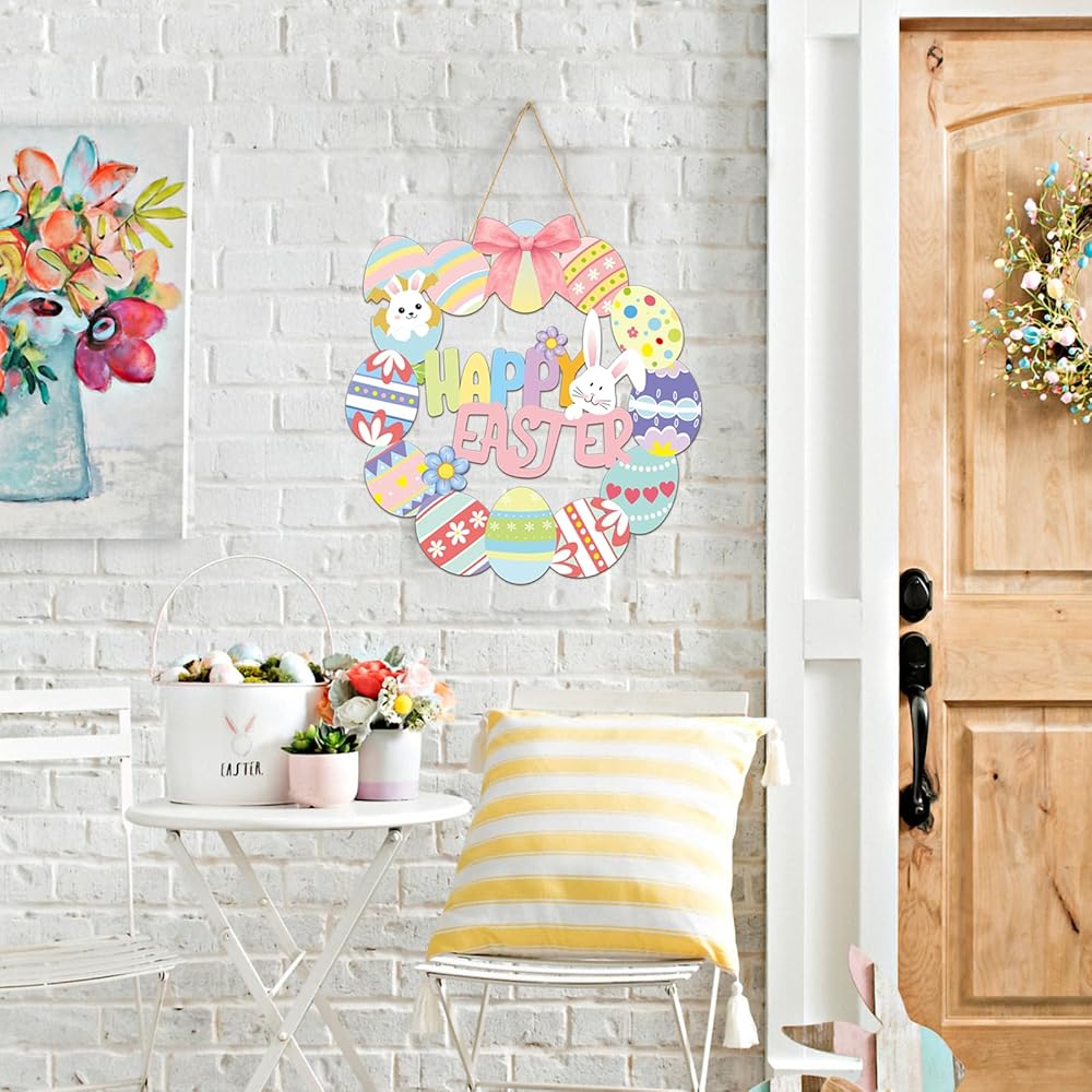 • لافتة باب عيد الفصح - تتميز لافتة إكليل الخشب الخشبية المكونة من قطعة واحدة من بيض عيد الفصح بألوان زنبركية نابضة بالحياة وحبل تعليق مرفق مسبقًا لتزيين عيد الفصح الفوري على الأبواب أو الجدران أو النوافذ.