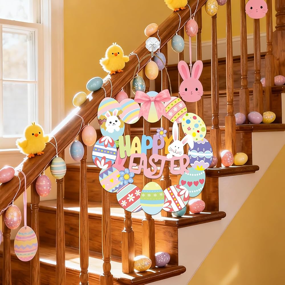 • لوحة ألوان ربيعية نابضة بالحياة - مطبوعة بألوان وردية وخضراء ناعمة، يضيف إكليل خشب البيض هذا لمسة مبهجة إلى ديكور عيد الفصح المعلق، مما يعزز المواقد أو المداخل أو أي مساحة احتفالية.