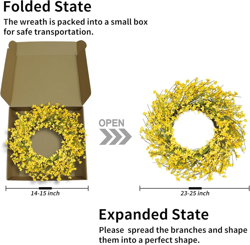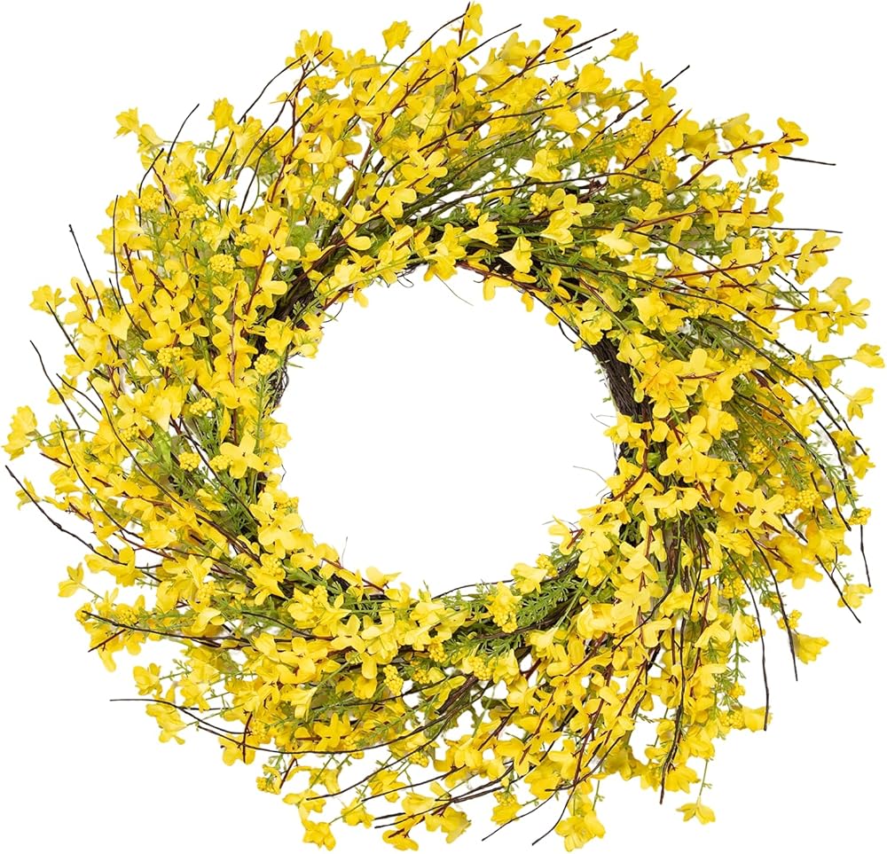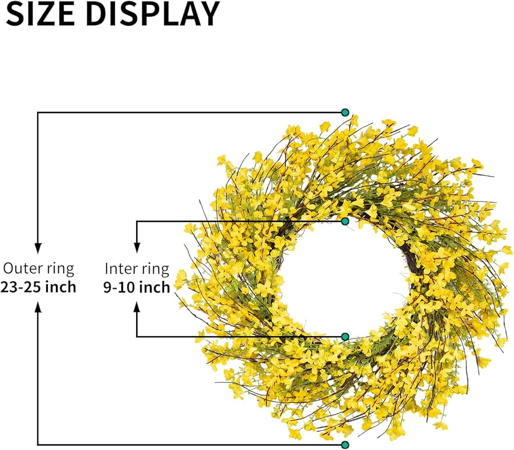 【إكليل ربيع فورسيثيا أصفر نابض بالحياة للباب الأمامي】 رحب بالموسم مع إكليلنا مقاس 24 بوصة (يمتد إلى 23-25 بوصة)، المليء بزهور فورسيثيا الصفراء النابضة بالحياة والفروع الداكنة والمساحات الخضراء. حجم مثالي ومصمم كإكليل للباب الأمامي لخلق مدخل مبهج للربيع وعيد الفصح.