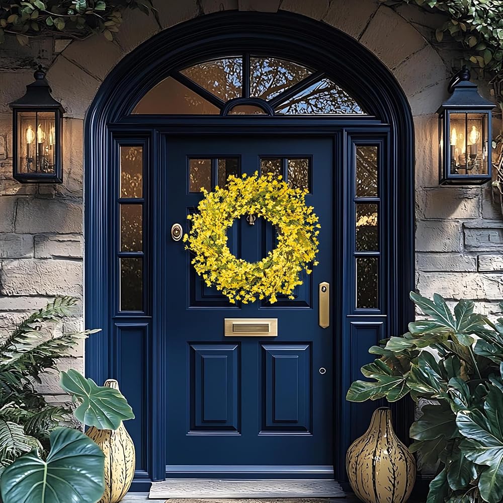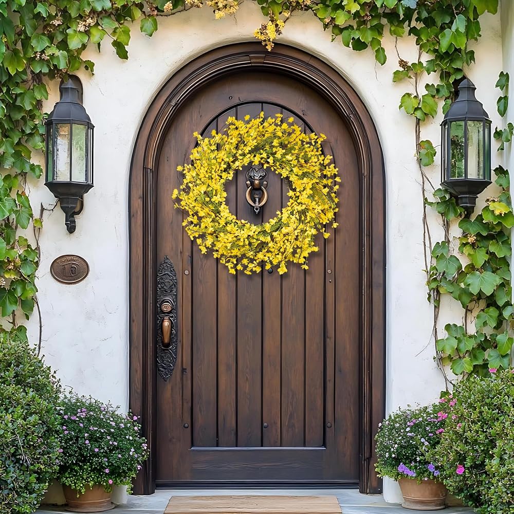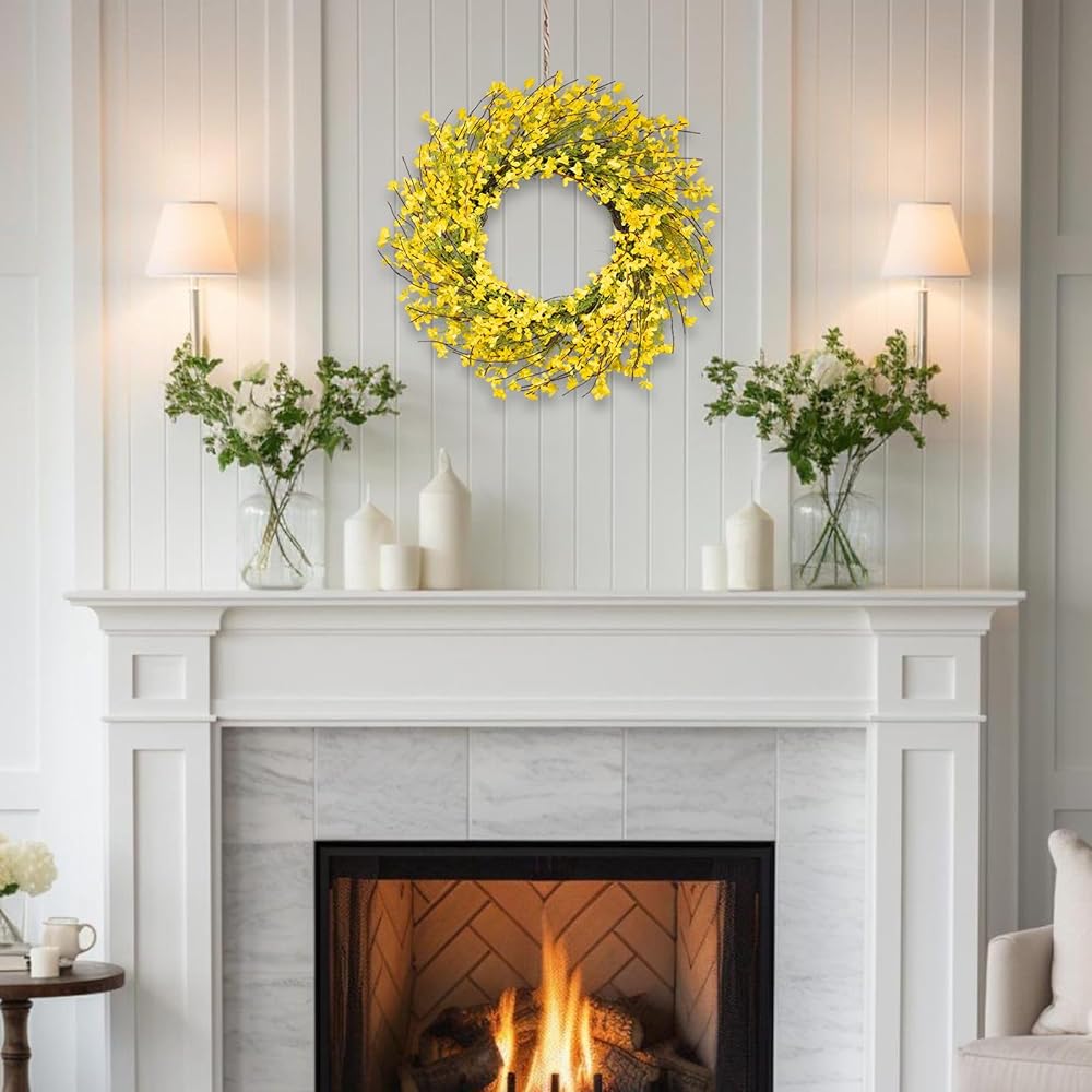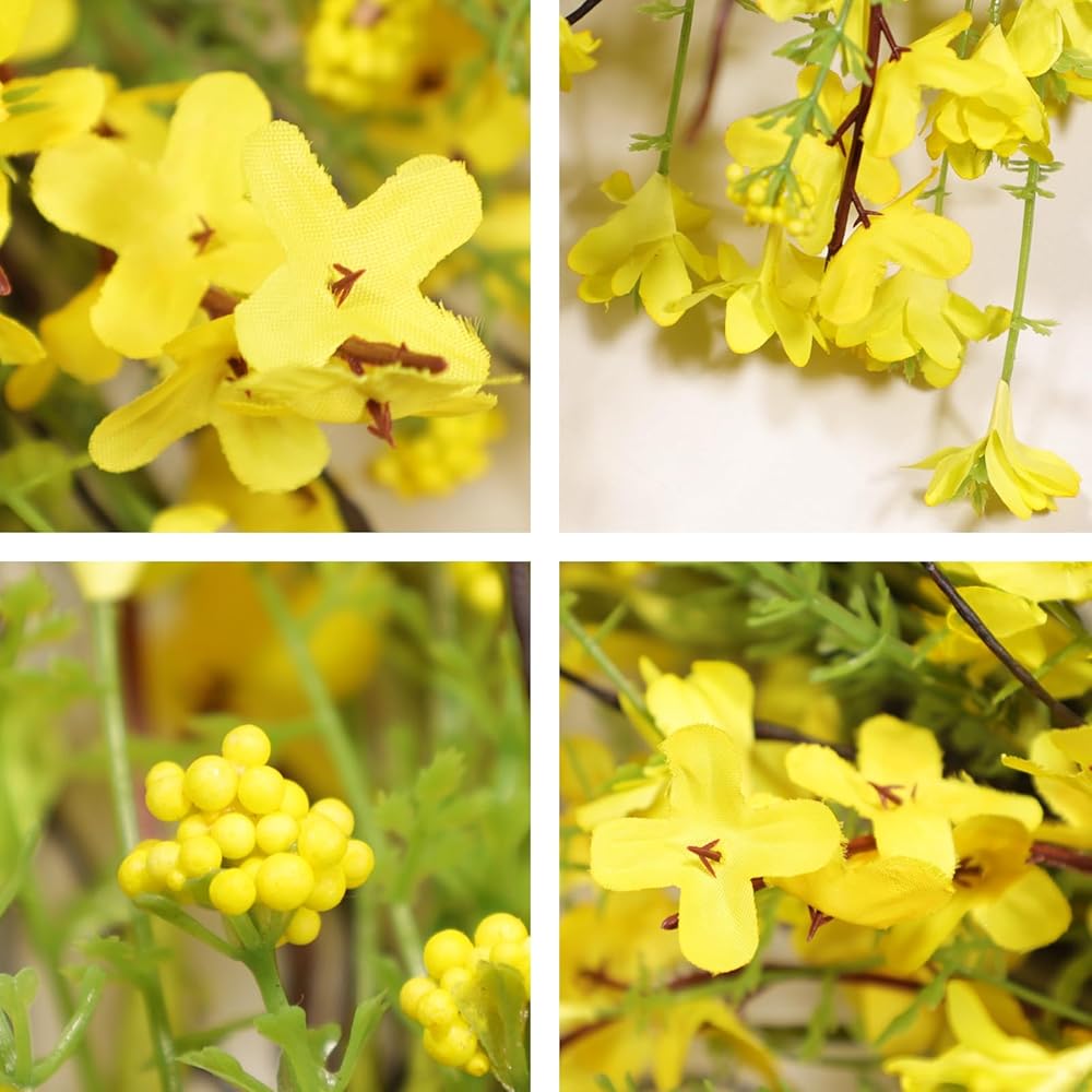 【زهور صناعية فاخرة على قاعدة من نبات العنب الطبيعي】تتميز بأزهار فورسيثيا من القماش عالي الجودة مرتبة بشكل آمن على قاعدة إكليل من نبات العنب الريفي المتين. يقدم هذا الإكليل الاصطناعي جمال الزهور الطازجة بدون صيانة، ويدوم لجميع المواسم كديكور منزلي في المزرعة