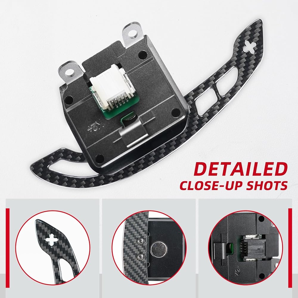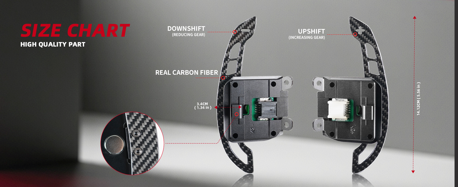 【قائمة العبوة】تتضمن العبوة: 2 × قاعدة محولات مجداف مغناطيسية، 2 × أغطية مجداف من ألياف الكربون اللامعة، 4 × براغي، 2 × مفكات براغي.