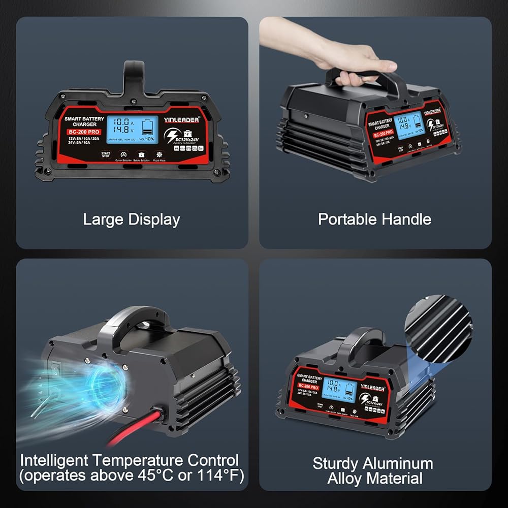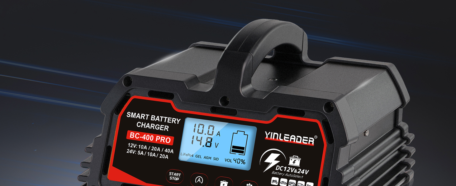 مجموعة واسعة من التطبيقات: يوفر تيار شحن متغير (12V-10A/20A/40A)/(24V-5A/10A/20A) وشحن بطارية 12V-LifePO4، مما يسمح لك باختيار التيار المناسب لحجم البطارية. مناسبة لشحن وإصلاح بطاريات الرصاص الحمضية، بما في ذلك AGM وSTD وGEL وSLA وما إلى ذلك، في السيارات والشاحنات وسيارات الدفع الرباعي والدراجات النارية وجزازات العشب والقوارب والمزيد.
