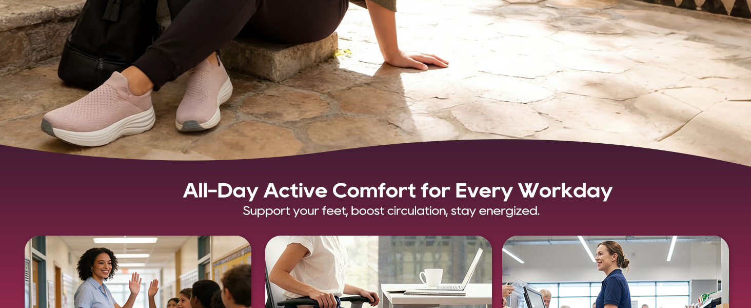 تخفيف الدوالي: تعمل هذه الأحذية على تخفيف ضغط الأوردة في الجزء السفلي من الساقين، مما يجعل هذه الأحذية الرياضية أكثر راحة أثناء ارتدائها لفترات طويلة، سواء كنت تتنقل أو تقوم بمهام.