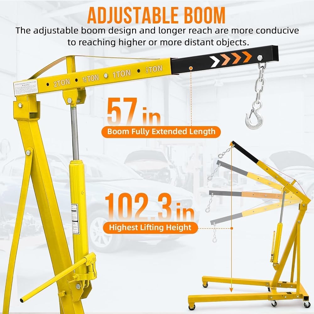 رافعة المحرك من الدرجة الصناعية: هيكل من الفولاذ الكربوني شديد التحمل مع قدرة رفع تصل إلى 4400 رطل (2 طن) وطلاء مسحوق مقاوم للتآكل لمتانة دائمة في أي ورشة عمل.