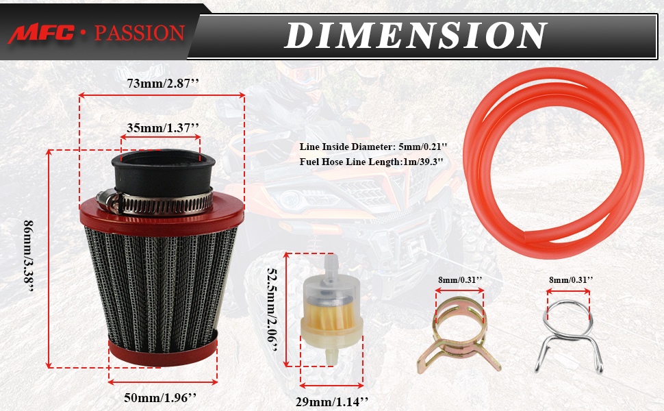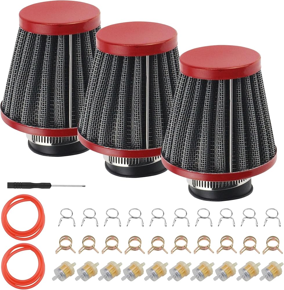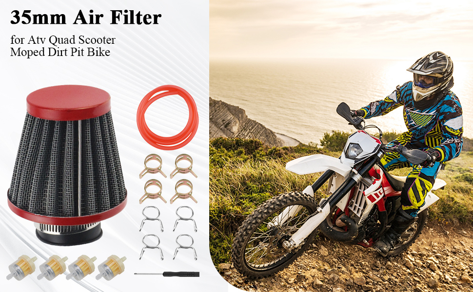 تشمل العبوة: 3 قطع × 35 مم/1.37 بوصة مرشحات هواء للدراجات النارية، 2 قطعة × 1 متر خط وقود، 10 قطع × مرشحات وقود، 20 قطعة × مشابك زنبركية.