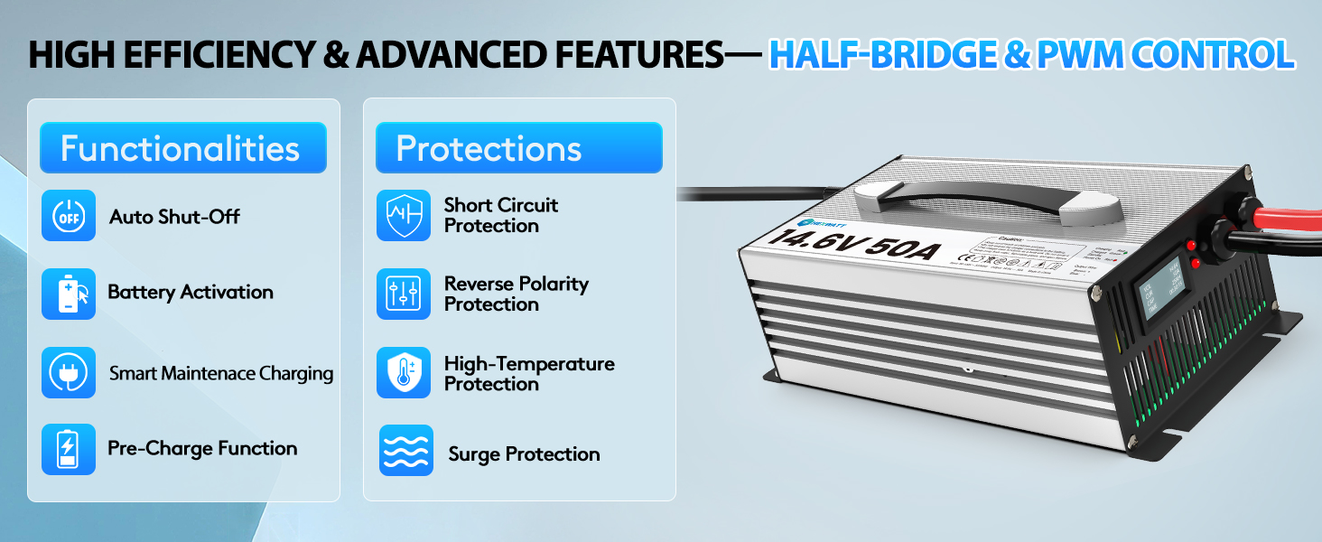 【تقنية نصف جسر وMCU-PFM عالية الكفاءة】تضمن طوبولوجيا دائرة نصف الجسر المتقدمة من النوع الحالي جنبًا إلى جنب مع التحكم MCU وتقنية PFM (تعديل تردد النبض) شحنًا مستقرًا وفعالًا وموفرًا للطاقة، ويتوافق تمامًا مع منحنيات شحن بطارية LiFePO4 المختلفة لشحن سريع موثوق.