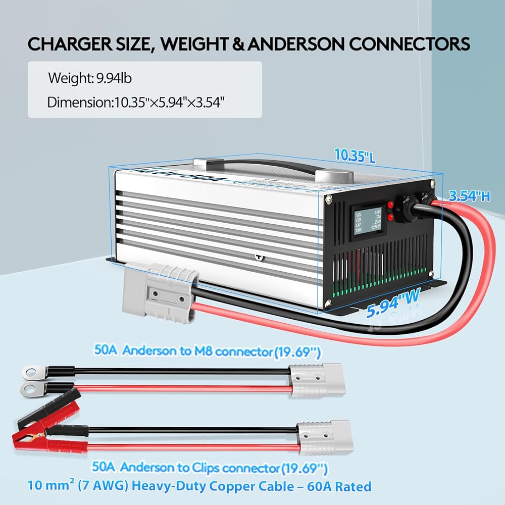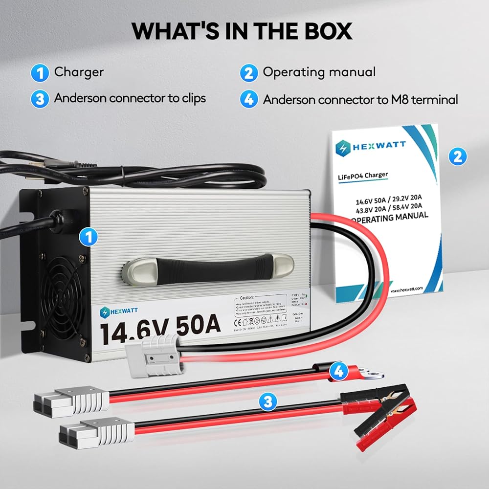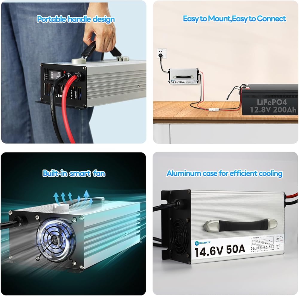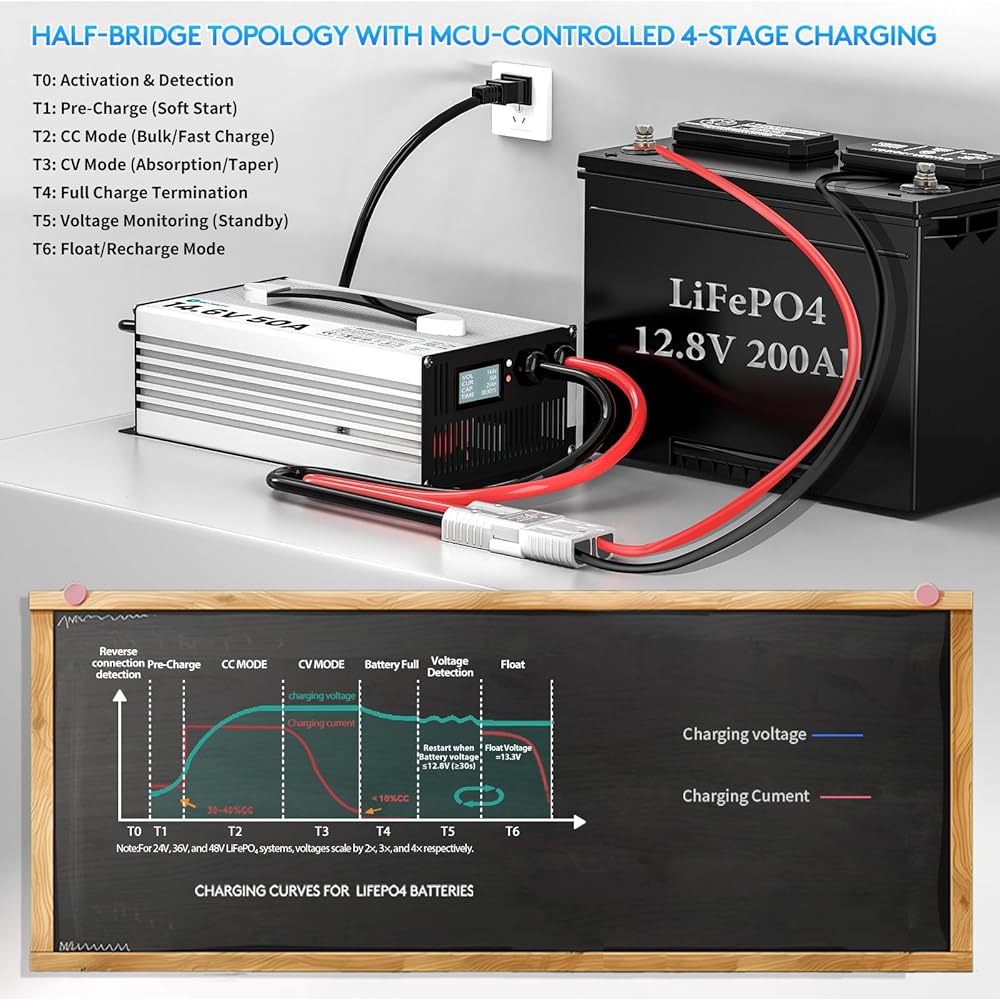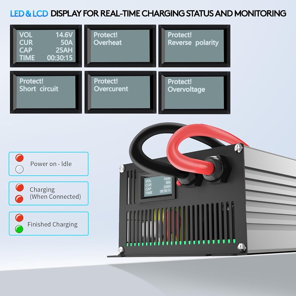 شاحن بطارية ليثيوم فائق السرعة 14.6 فولت 50 أمبير 12 فولت - حل قلق البطارية: اشحن بطارية LiFePO4 بقدرة 12 فولت 100 أمبير في ساعتين فقط، مما يقلل وقت الانتظار بشكل كبير. مثالية كشحن بطارية ليثيوم 12 فولت لشحن بطاريات RV، والبطاريات البحرية، وتخزين الطاقة الشمسية، وتطبيقات الطاقة الخارجية، مما يوفر طاقة سريعة وموثوقة كلما احتجت إليها.