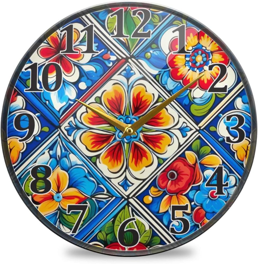 ساعة حائط من بلاط السيراميك المكسيكي 1 - ساعة حائط دائرية صامتة غير موقوتة، ساعات إبداعية حديثة تعمل بالبطارية لغرفة المعيشة والمطبخ والمنزل والمكتب 12 بوصة