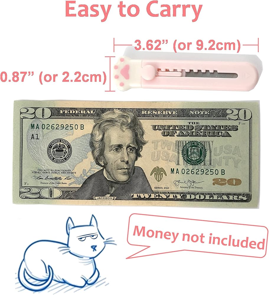 • سهلة الحمل - سكين الجيب الصغير اللطيف صغير الحجم وخفيف الوزن. تناسب أداة تقطيع صندوق القطط محفظتك وحقيبتك وراحة يدك، وسهلة الحمل والتخزين. حجم السكين اللطيف هو 3.62 بوصة × 0.87 بوصة (أو 9.2 سم × 2.2 سم).