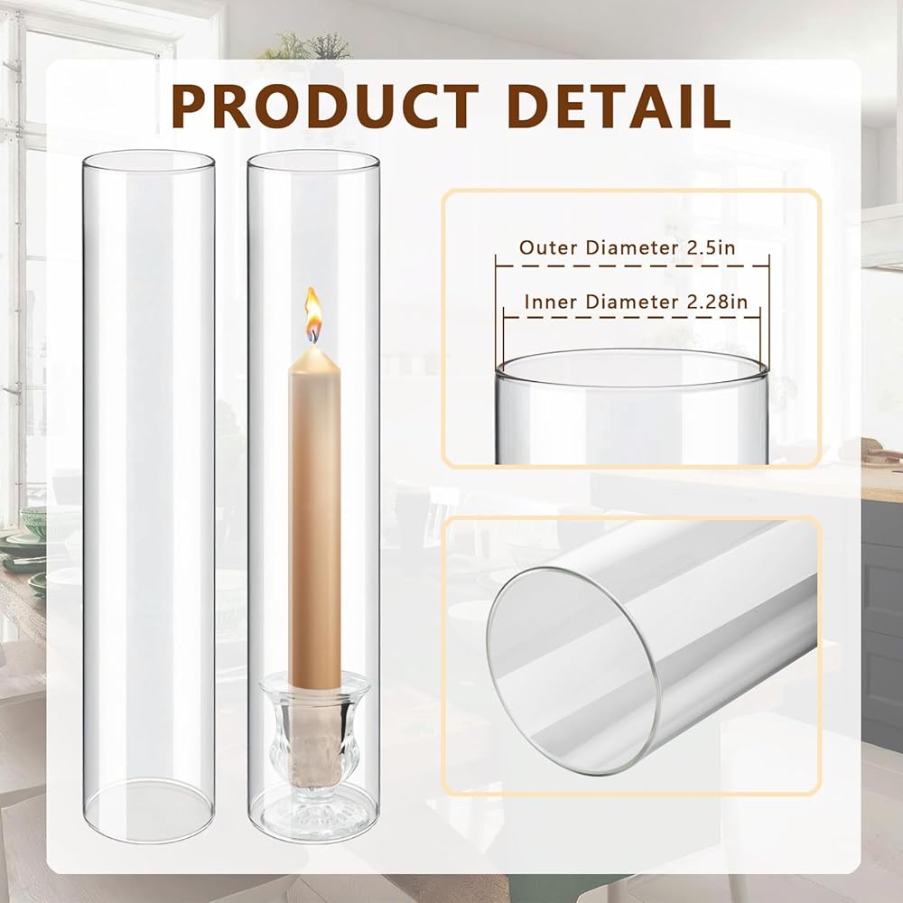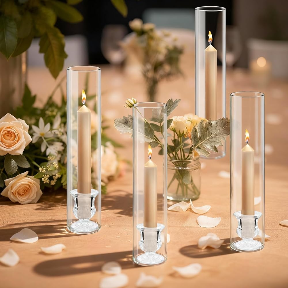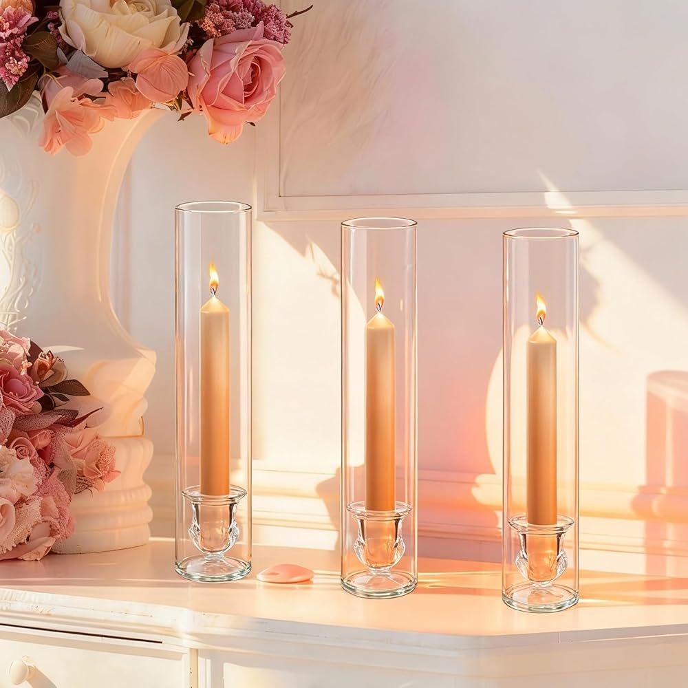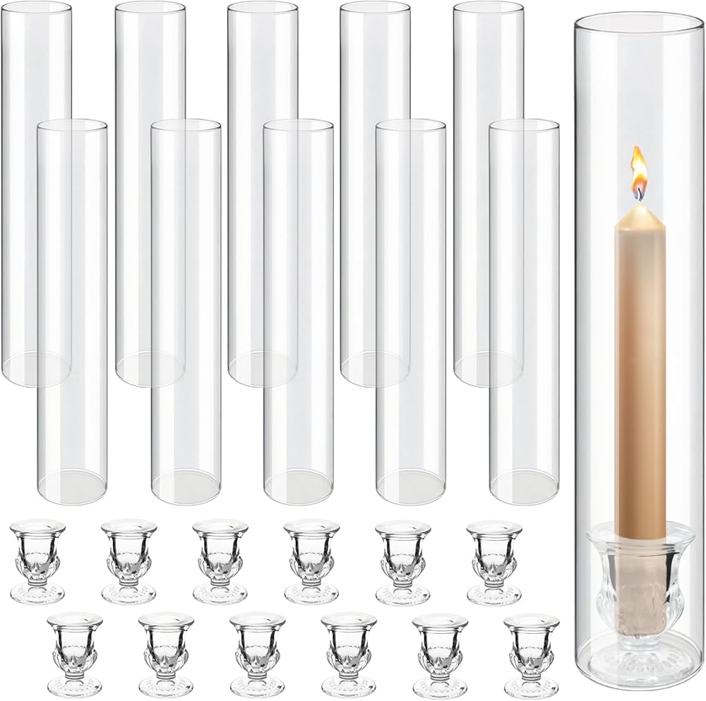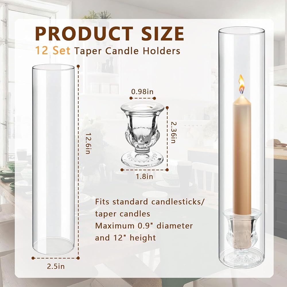 Complete Set for Grand Displays: Includes 12 elegant, clear glass hurricane cylinders (12.6”H) paired with 12 matching taper candle holders (2”H). Perfect for creating a cohesive and impressive tablescape
