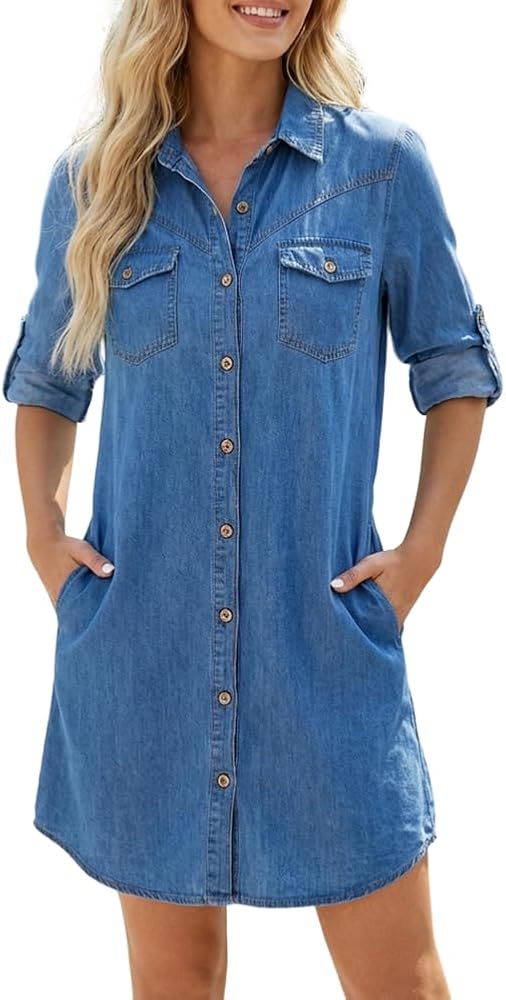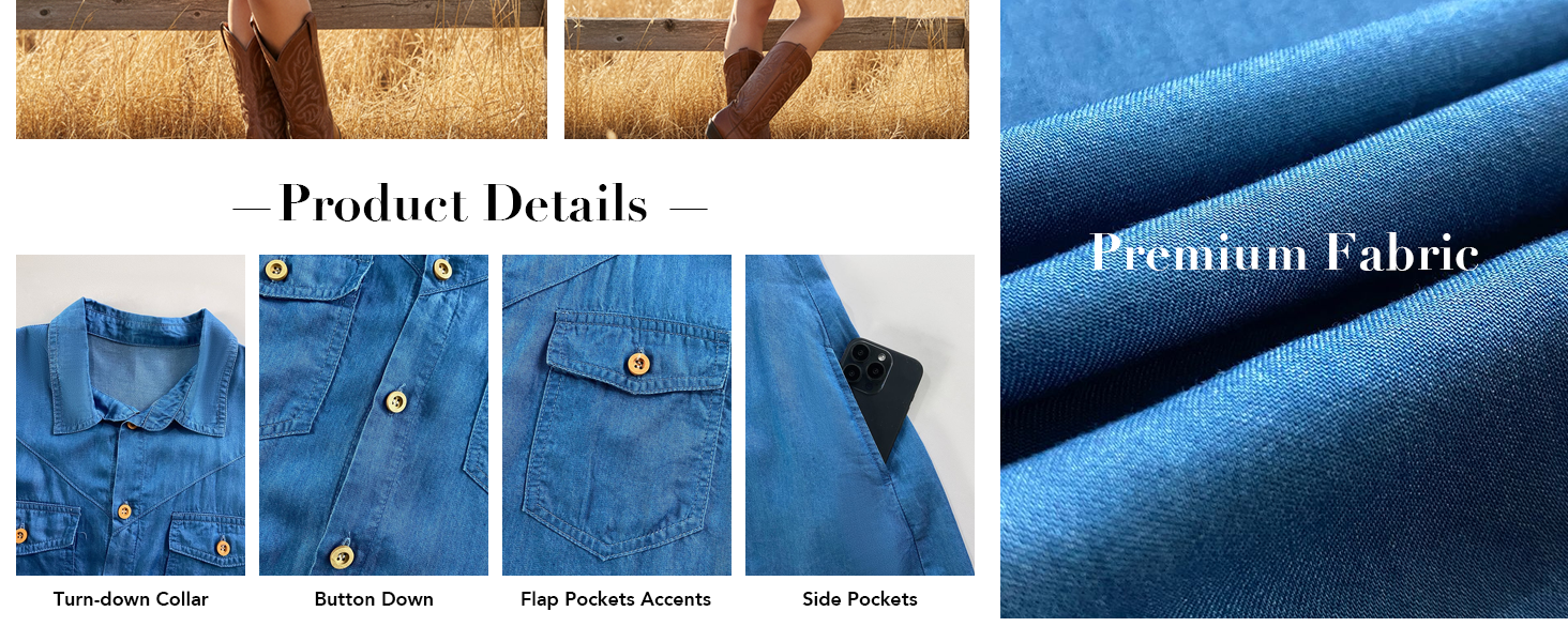تصميم كلاسيكي وأنيق: مصمم بياقة مطوية وأزرار سفلية كاملة من الأمام للحصول على مظهر نظيف ولامع. تتيح لك الأكمام ذات العروة الدوارة التبديل بين الأطوال الطويلة و3/4. تضيف الجيوب المزخرفة لمسة كلاسيكية من الدنيم، بينما تعزز الحاشية غير المتماثلة الحركة وتخلق صورة ظلية جذابة وطويلة