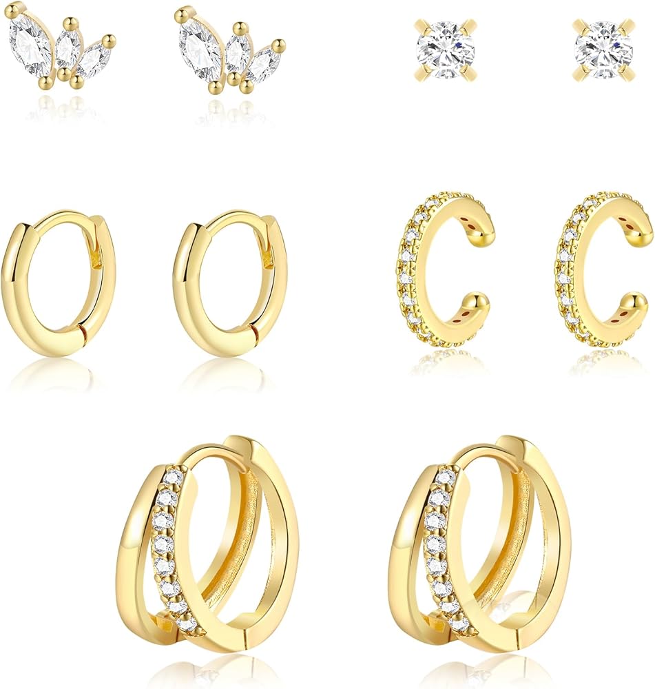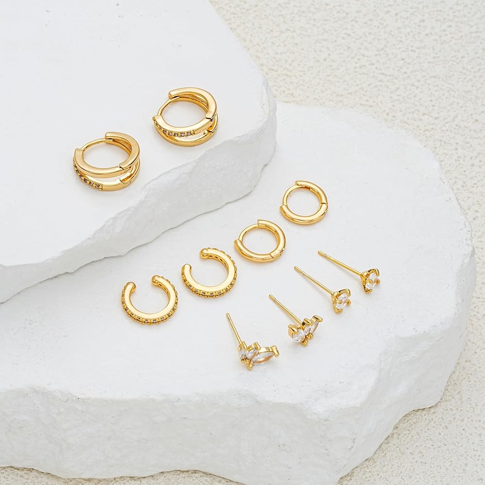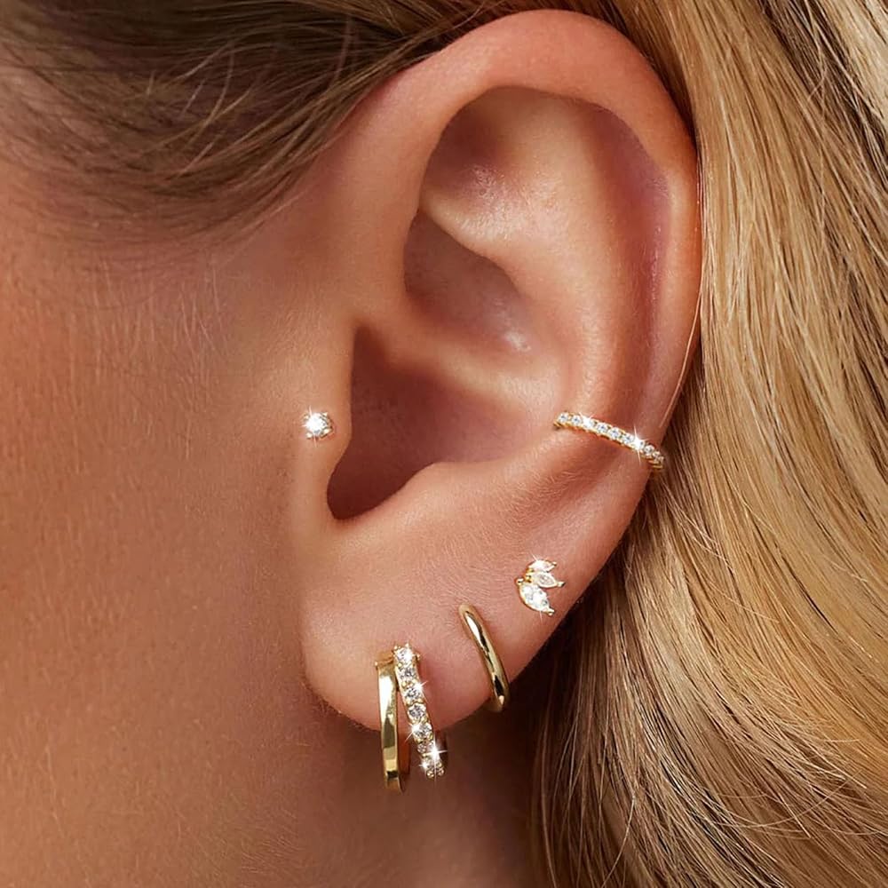 • مجموعة الأقراط الذهبية: تقدم هذه المجموعة من الأقراط الذهبية 5 تصميمات مختلفة، بما في ذلك الأطواق المزدوجة الكلاسيكية، وأزرار الزركونيا المكعبة، وأساور الأذن. يجمع التصميم الفريد بين بريق الماس وبساطة المعدن النقي، مما يخلق خيارًا أنيقًا ومتنوعًا للأكسسوارات