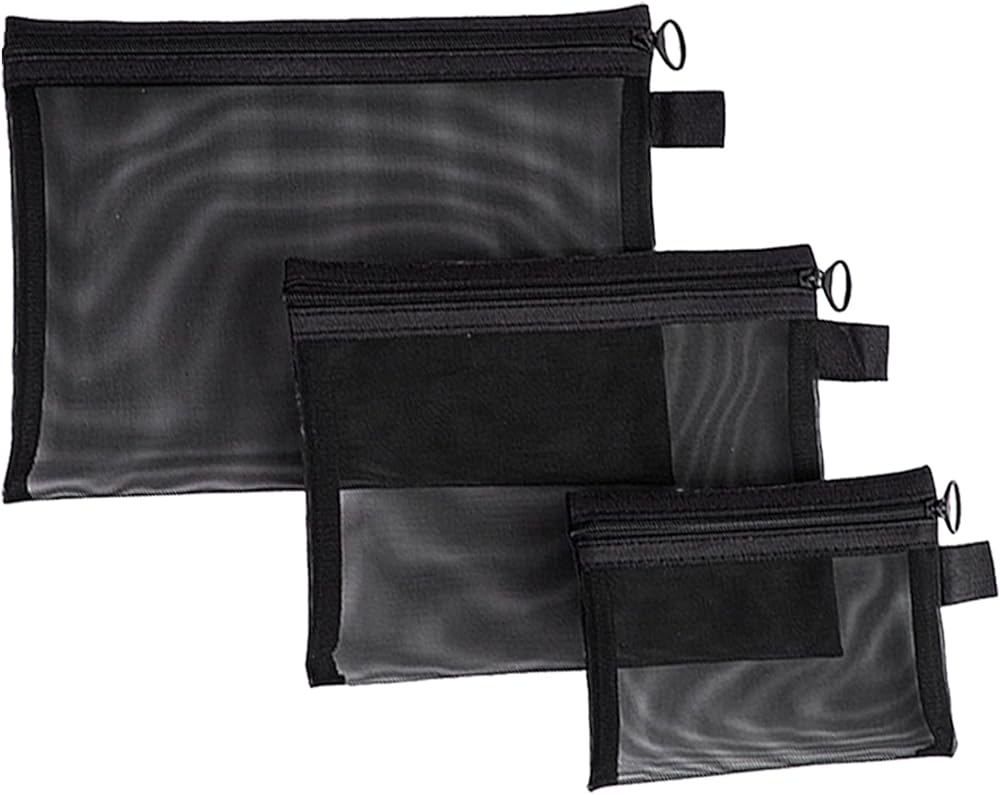مجموعة حقائب مكياج مكونة من 3 قطع بسحاب شبكي، حقيبة مستحضرات تجميل شبكية محمولة للسفر وحقائب تخزين أدوات الزينة وحقائب تنظيم محفظة أقلام الرصاص للمنزل والمكتب يوميًا أو ملحقات السفر للحفاظ على الأشياء الصغيرة (أسود)
