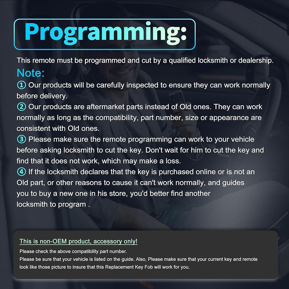 الميزات: إيجابيات جهاز التحكم عن بعد بدون مفتاح: مصنوع من مادة بلاستيكية ومعدنية. يتميز بملاءمة جيدة، ولن ينكسر أو يتشقق بسهولة أثناء الاستخدام. استجابة حساسة، يرجى التأكد من أن المفتاح له نفس نمط الزر وتأكد من التحقق من مظهر مفتاحك القديم، وطراز سيارتك وسنتها، بالإضافة إلى معرف لجنة الاتصالات الفيدرالية (FCC) ورقم الجزء الموجود على الجزء الخلفي من مفتاحك القديم للتأكد من مطابقتها لما هو موضح على موقعنا الإلكتروني.