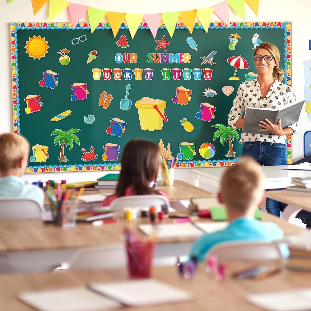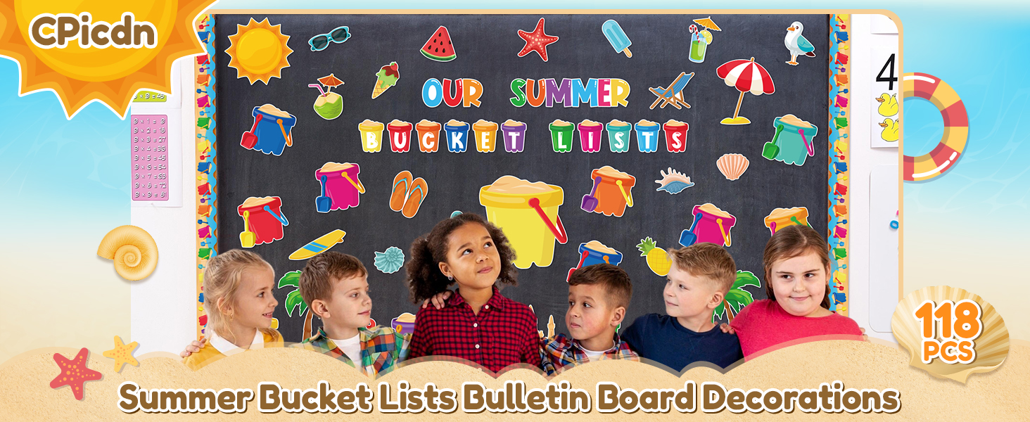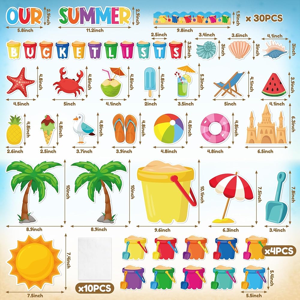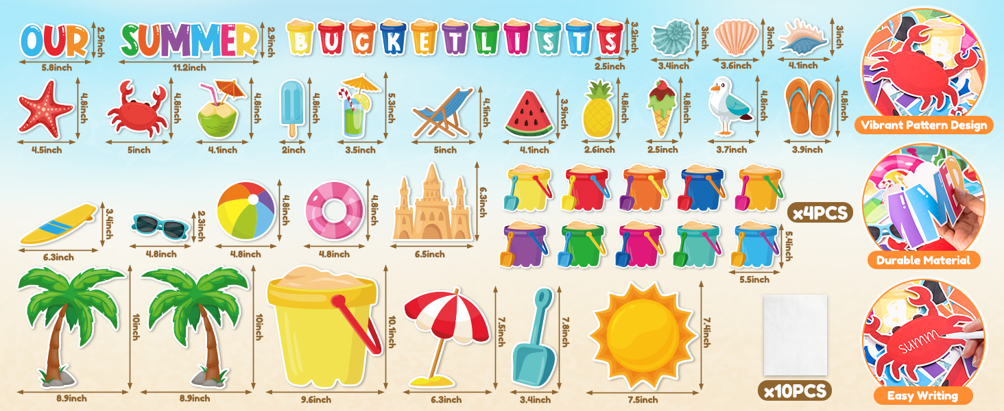 • زينة لوحة الإعلانات: سوف تحصل على 118 قطعة من زخارف لوحة الإعلانات الصيفية. تتضمن 41 قطعة من قطع دلو الرمل، و24 قطعة من قطع عناصر الشاطئ لأشعة الشمس الصيفية، و30 قطعة من قطع الحدود، و13 قطعة من الحروف و10 أوراق من الملصقات لاحتياجات تزيين منزلك في الفصل الدراسي!