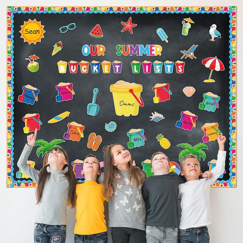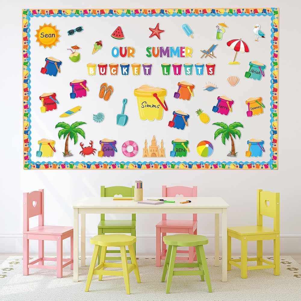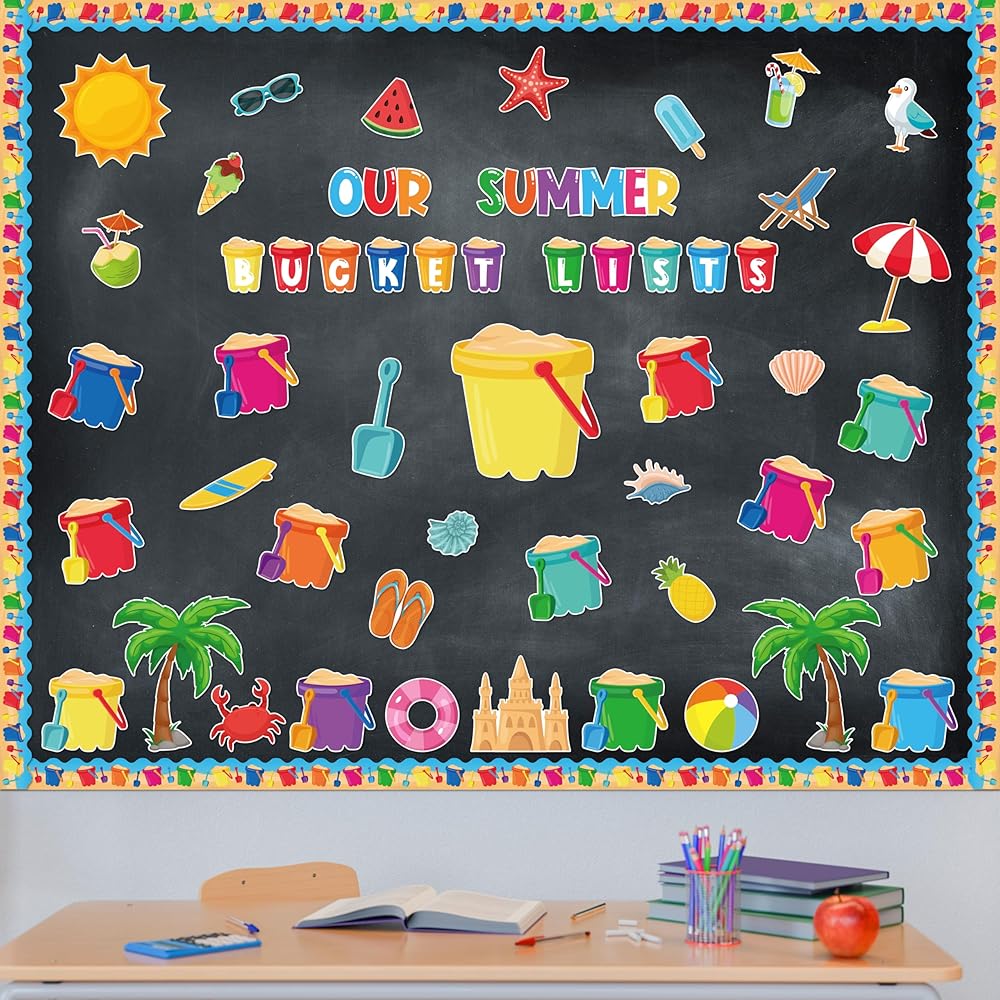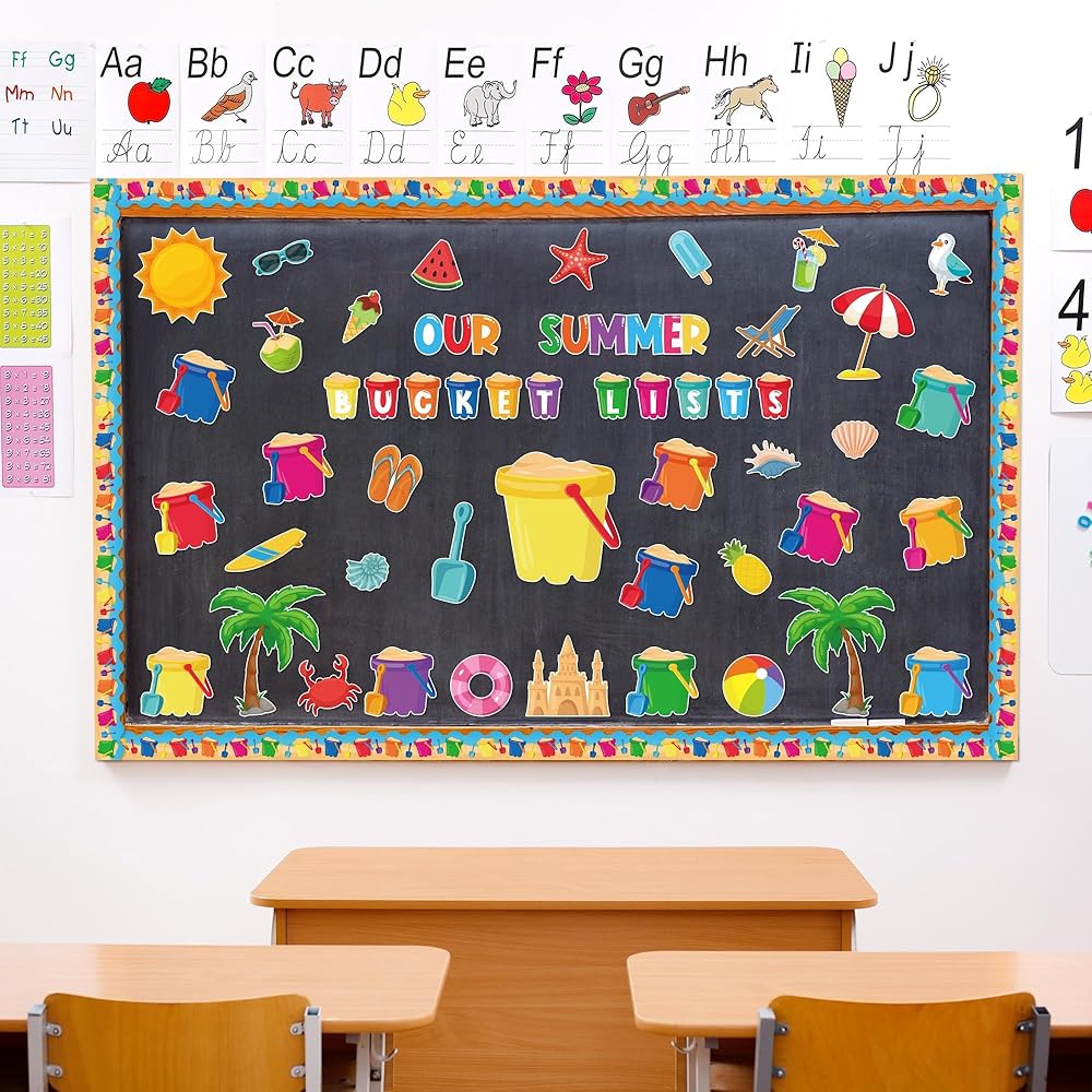• زينة لوحة الإعلانات: سوف تحصل على 118 قطعة من زخارف لوحة الإعلانات الصيفية. تتضمن 41 قطعة من قطع دلو الرمل، و24 قطعة من قطع عناصر الشاطئ لأشعة الشمس الصيفية، و30 قطعة من قطع الحدود، و13 قطعة من الحروف و10 أوراق من الملصقات لاحتياجات تزيين منزلك في الفصل الدراسي!