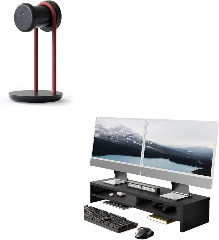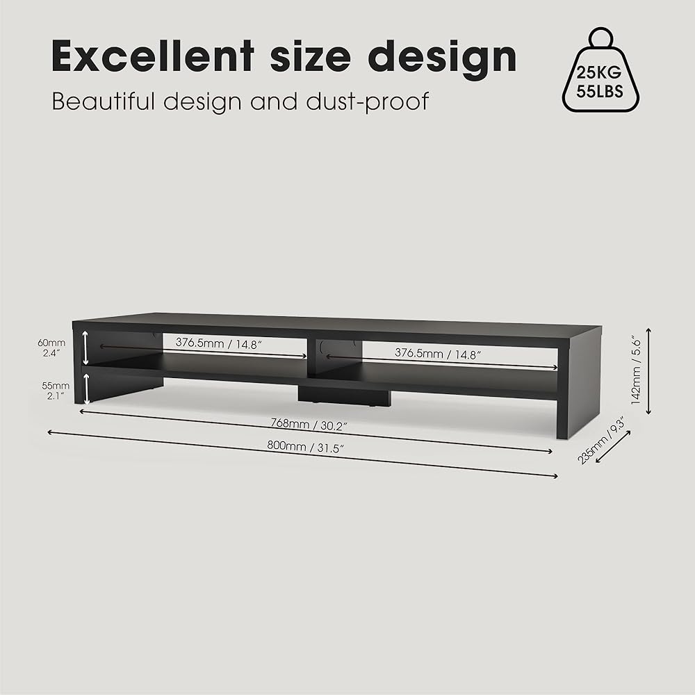 【منظم رف المكتب】الأبعاد: 31.5 بوصة × 9.3 بوصة × 5.6 بوصة، مصمم لإعدادات الشاشة، يتميز حامل الشاشة المزدوج هذا بهيكل من طبقتين ومقصورتين مفتوحتين لإدارة الكابلات. قم بترويض فوضى مكتبك: قم بتخزين دفاتر الملاحظات والوسادات وحتى نبات صغير!