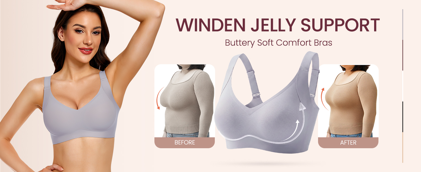 • 【Innovative Jelly Lift Support for All-Day Comfort】Experience the next level of comfort with our innovative jelly lift support system. This wireless bra features a unique 360° jelly lift design that mimics the support of traditional underwires with ultra comfort. It offers a flexible, soft structure that contours to your body, providing a natural lift and superior bounce control, ensuring comfort that lasts all day.
