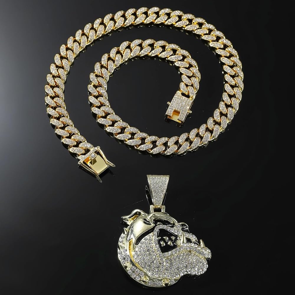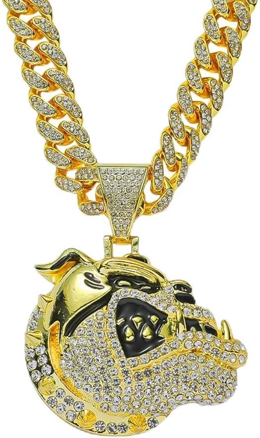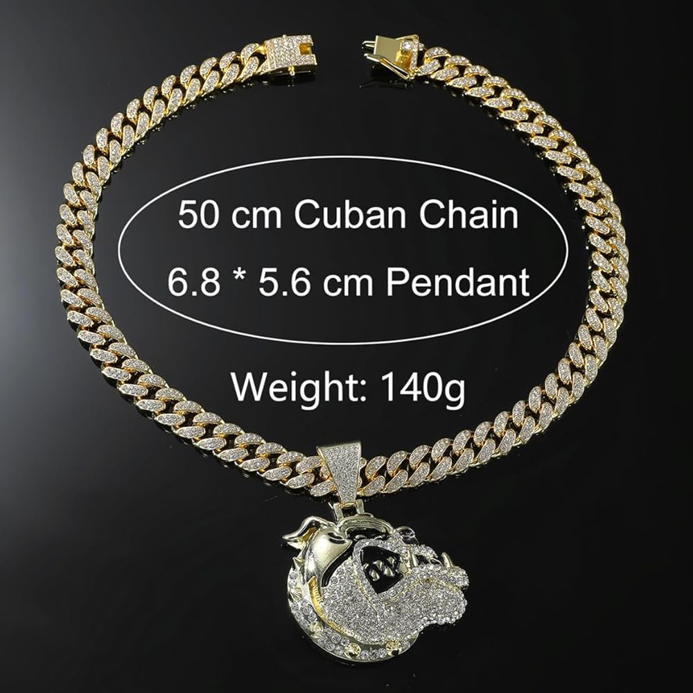 Gold bulldog head cuban chain necklace, hip hop bulldog head pendant necklace for men, iced out bulldog head chunky necklace, sparkling bulldog head cuban necklace rock rapper bulldog head jewelry, men's gothic punk rock bulldog head cuban link chain, rhinestone bulldog head statement necklace accessories