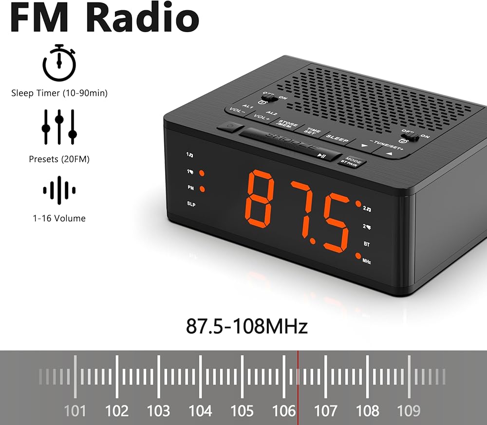 BLUETOOTH: Use Bluetooth wireless to connect your smartphone or tablet to play your favorite music, audiobooks or podcast to your FM radio alarm clock.