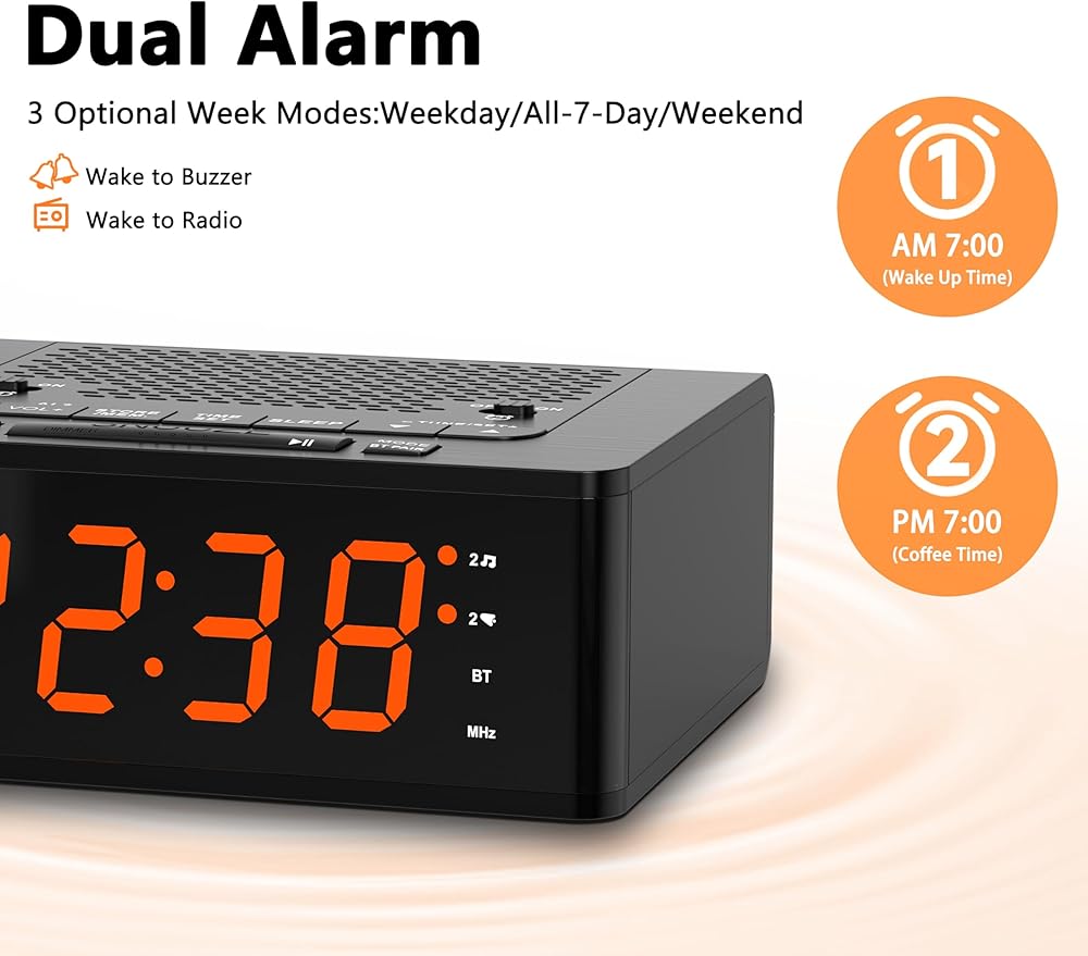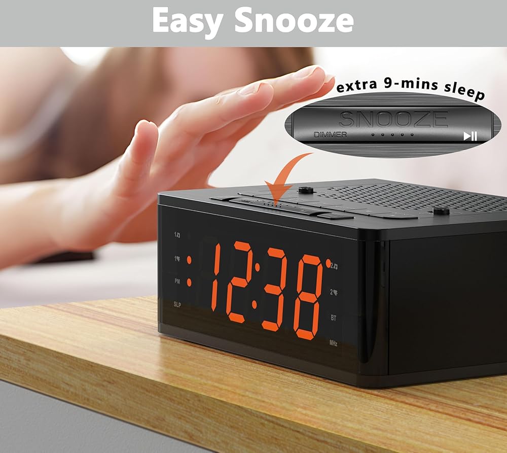 ساعة منبه iTOMA لغرفة النوم مع راديو FM، بلوتوث، شاشة LED خافتة، مؤقت للنوم، حجم قابل للتعديل، منبه مزدوج مع زر تشغيل/إيقاف، ساعة بجانب السرير للبالغين وكبار السن 515