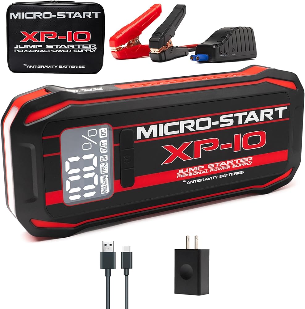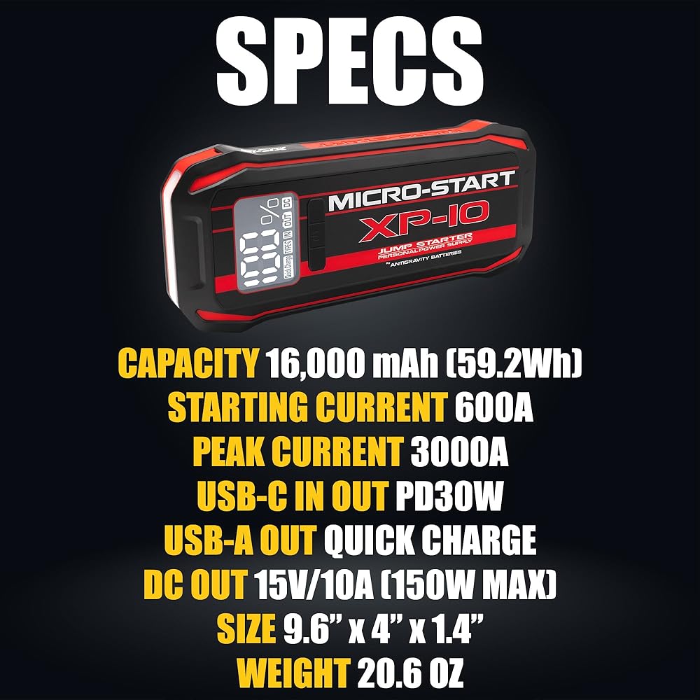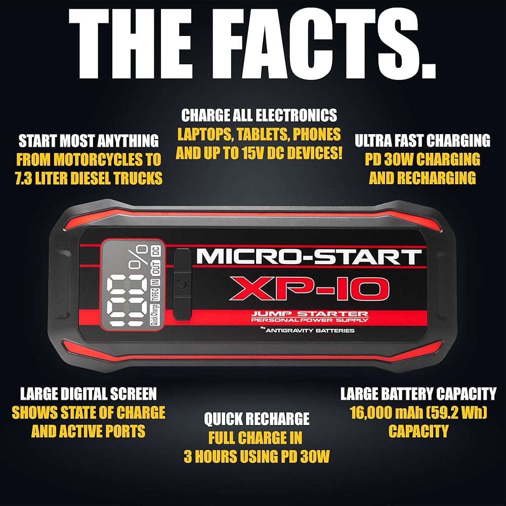 The Antigravity Batteries XP-10 is a powerful and compact 12V lithium jump starter engineered for drivers who need reliable starting capability without the bulk of traditional jump packs. Designed and engineered in the USA, the XP-10 is capable of jump-starting gas engines and diesel engines up to 7.3 liters, making it a dependable solution for cars, trucks, and SUVs. Despite its small footprint, the XP-10 delivers impressive starting power and doubles as a portable power source for everyday electronics. USB-C Power Delivery (30W) fast charging allows the unit to recharge quickly and power devices such as phones, tablets, and other USB-powered accessories. A large digital display provides clear visibility of battery status and system alerts. Built with Antigravity's advanced lithium technology and integrated safety protections, the XP-10 is designed for safe, dependable operation in real-world conditions. Whether kept in your vehicle for emergencies or used for work, travel, or outdoor adventures, the XP-10 offers a balanced combination of power, portability, and modern charging convenience.