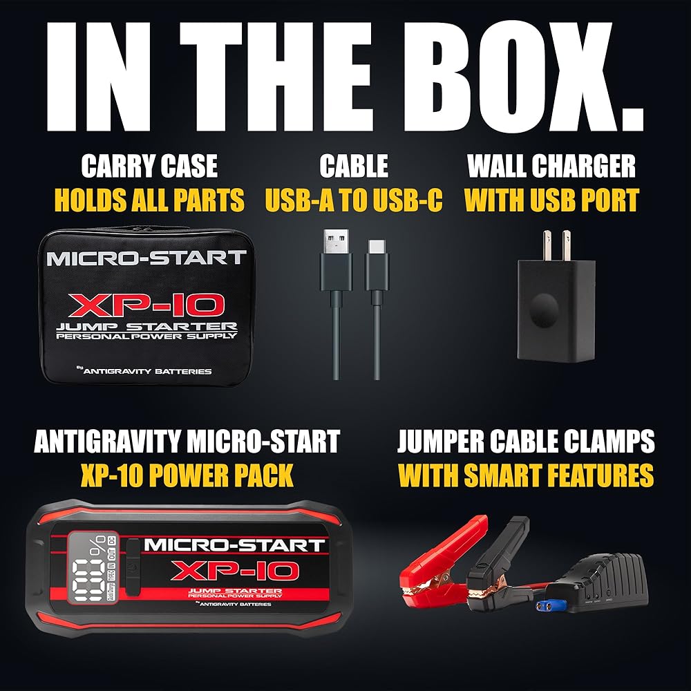 • COMPLETE KIT INCLUDED Includes the XP-10 Jump Starter, heavy-duty jumper clamps, USB-A to USB-C charging cable, zippered carrying case, and user manual—everything needed to stay prepared.