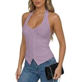 • For a better fit, we recommend ordering one size smaller. Unique Open-back Design: The button up halter tops design features a deep V-neck and open back, effectively elongating the neckline, refining the face shape, and accentuating the elegant curves of the collarbone and bust. Additionally, during the hot summer months, the generous skin exposure offers unparalleled breath ability.