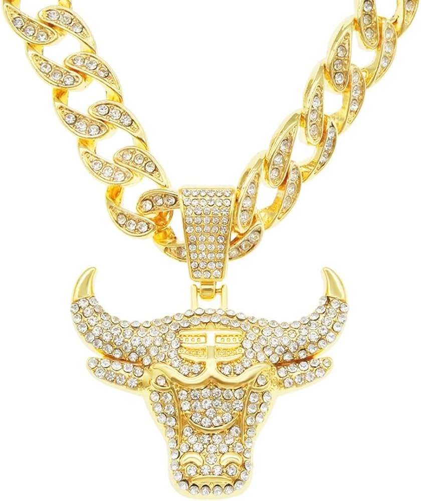 Gold bull head cuban chain necklace, hip hop bull head pendant necklace for men, iced out bull head chunky necklace, sparkling bull head cuban necklace rock rapper bull head jewelry, men's gothic punk rock bull head cuban link chain, rhinestone bull head statement necklace accessories