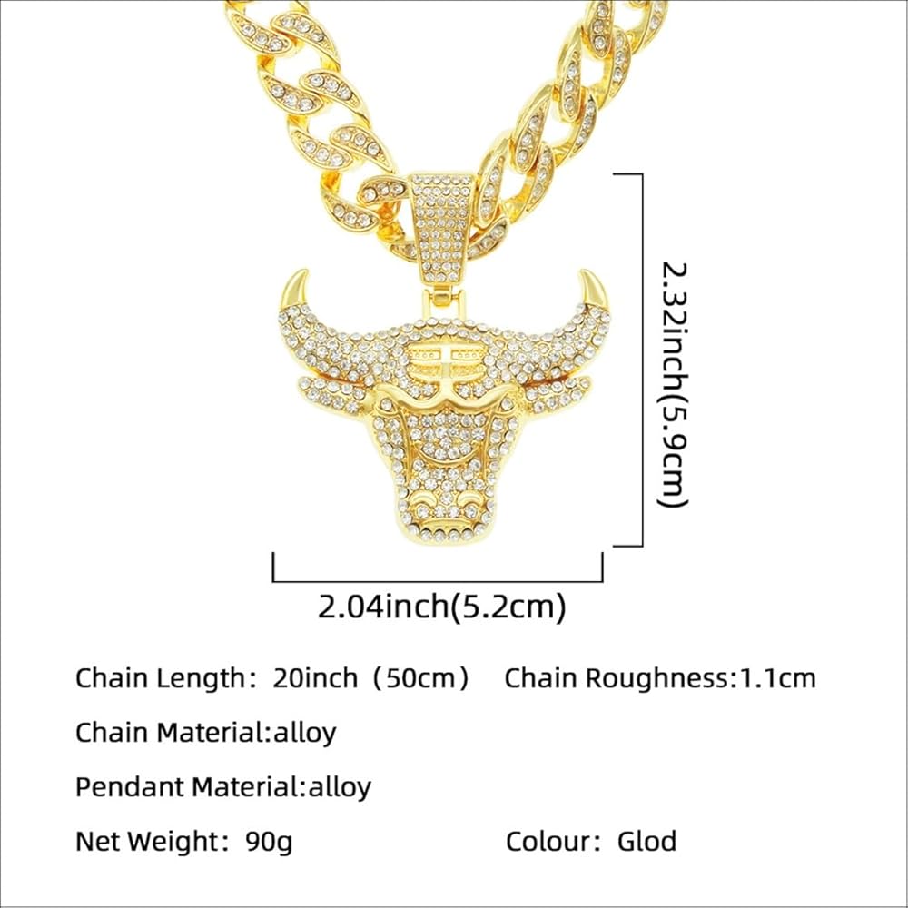 Size: The gold bull head shaped cuban necklace is about 5.9cm long and 5.2cm wide. With a net weight of 90g, this iced out bull head necklace delivers a sleek and modern look.