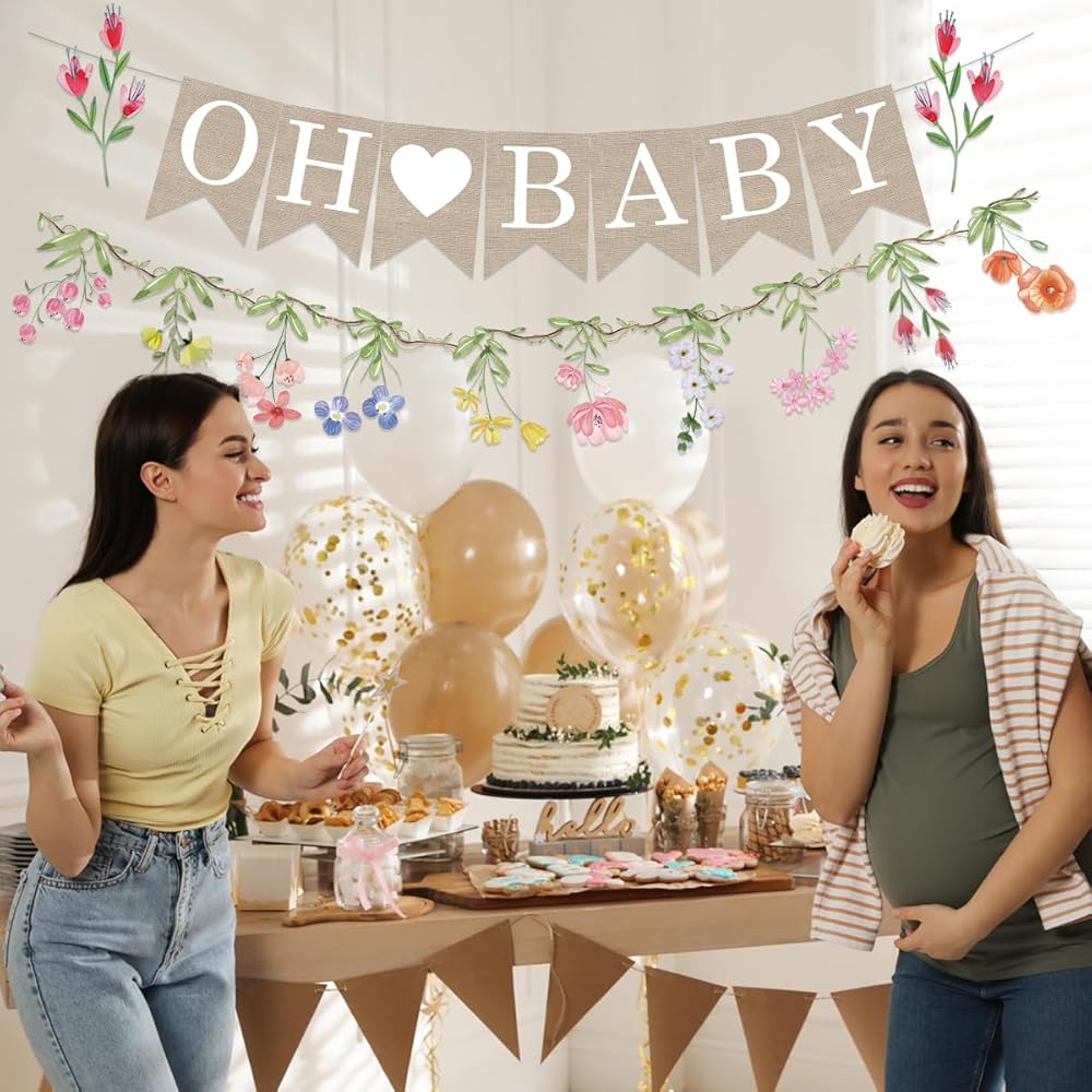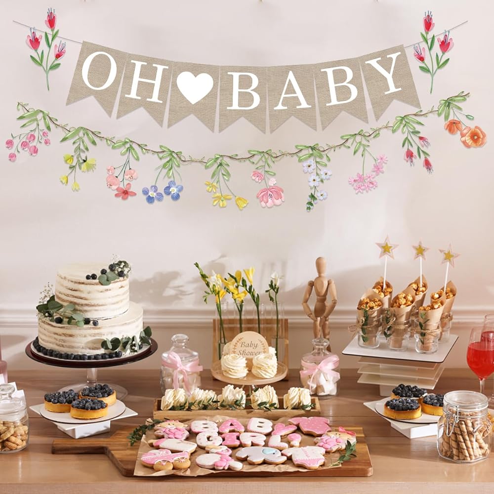 wildflower theme baby shower banner: This burlap banner features the phrase "oh Baby" surrounded by multicolored wildflowers Perfect for girl floral theme baby shower or birthday party decor