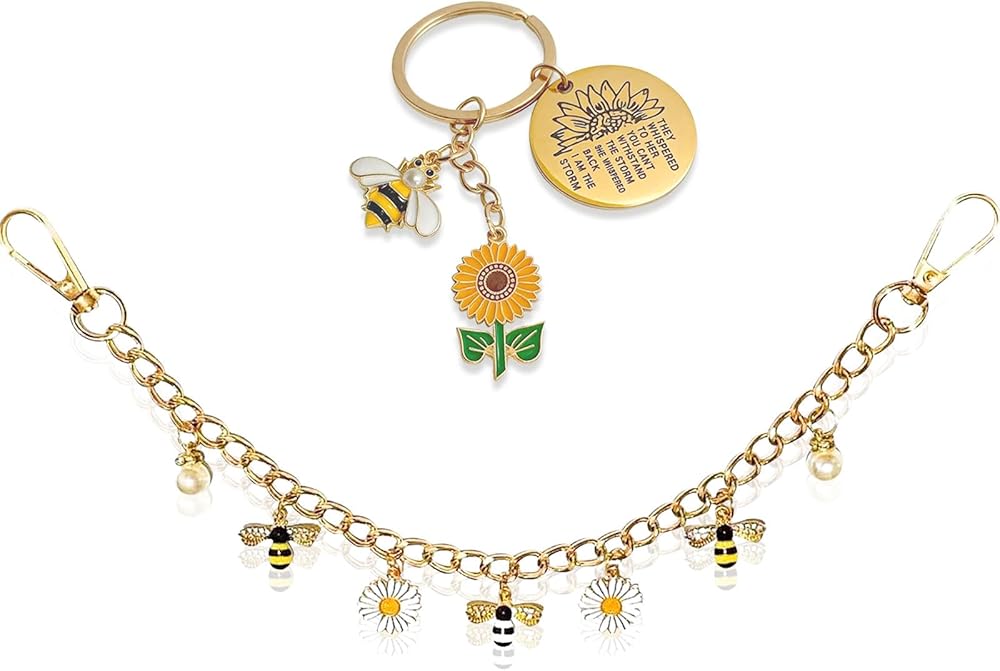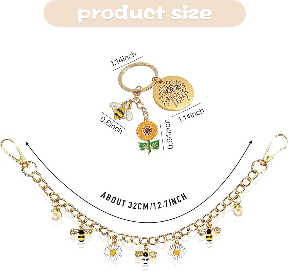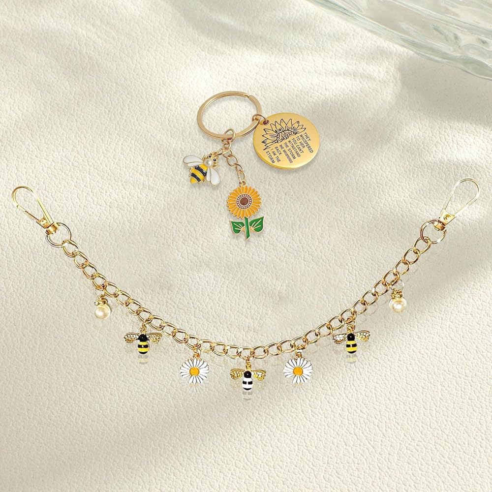قطعتان من حليات حقيبة النحلة ديزي اللؤلؤية - سلاسل حقائب ذهبية اللون مع سلاسل مفاتيح على شكل نحلة وعباد الشمس، سلسلة تمديد قابلة للتبديل لحقائب اليد والمحافظ وحقائب اليد الكبيرة وإكسسوارات حزام كروس للنساء