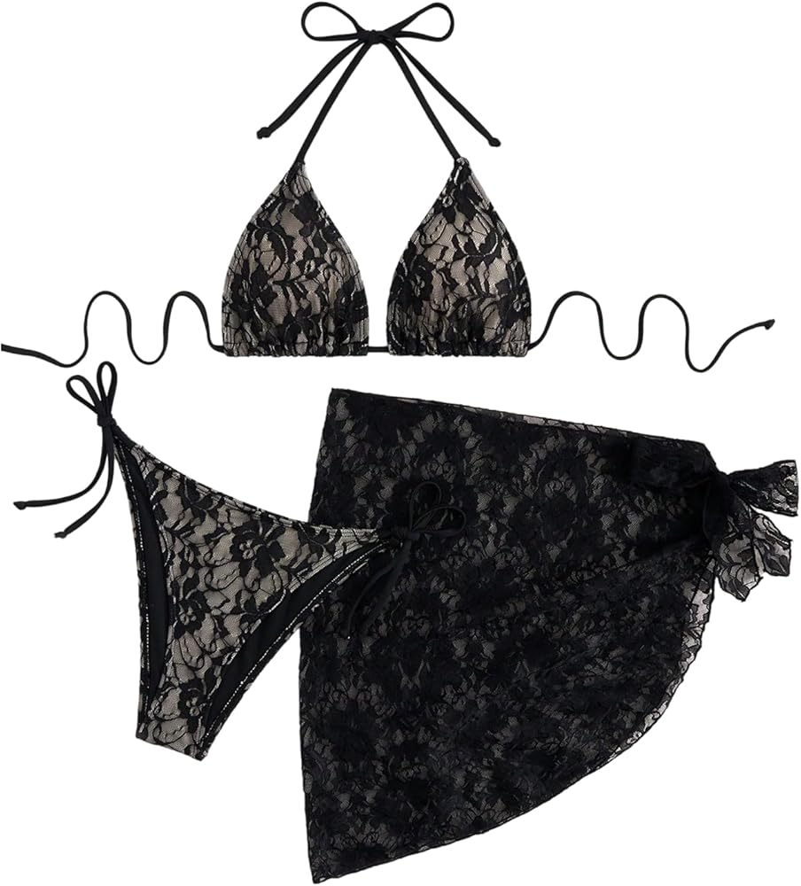 • Fabric: 3 piece bathing suits for women, lace bikinis, sexy halter bikini top with side tie bottom, lace mini skirt cover up, sexy bathing suits