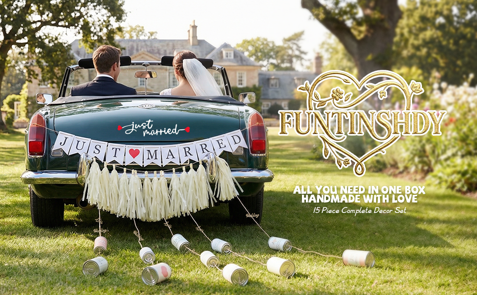 مجموعة ديكورات السيارة Just Married - مجموعة 15 قطعة لتزيين سيارة الزفاف مع 12 علبة من الصفيح لمصد السيارة واللافتة وملصقات النوافذ والشرابات - ملحقات سيارة الزفاف الرومانسية، لافتة Just Married للمركبة