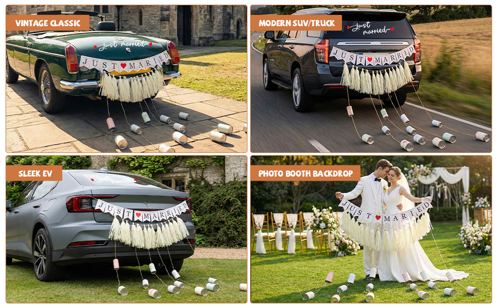 【إعداد سريع في دقائق - لا حاجة لأي أدوات】 يمكن أن يأتي كل منها مثقوبًا مسبقًا لسهولة الربط، والتصميم خفيف الوزن لن يخدش سيارتك. ما عليك سوى ربطها وتعليقها ولصقها - ستكون جاهزًا للتدحرج في أقل من 10 دقائق. مثالي للعرائس والعرسان المشغولين الذين يرغبون في مشهد توديع فوري وجميل.
