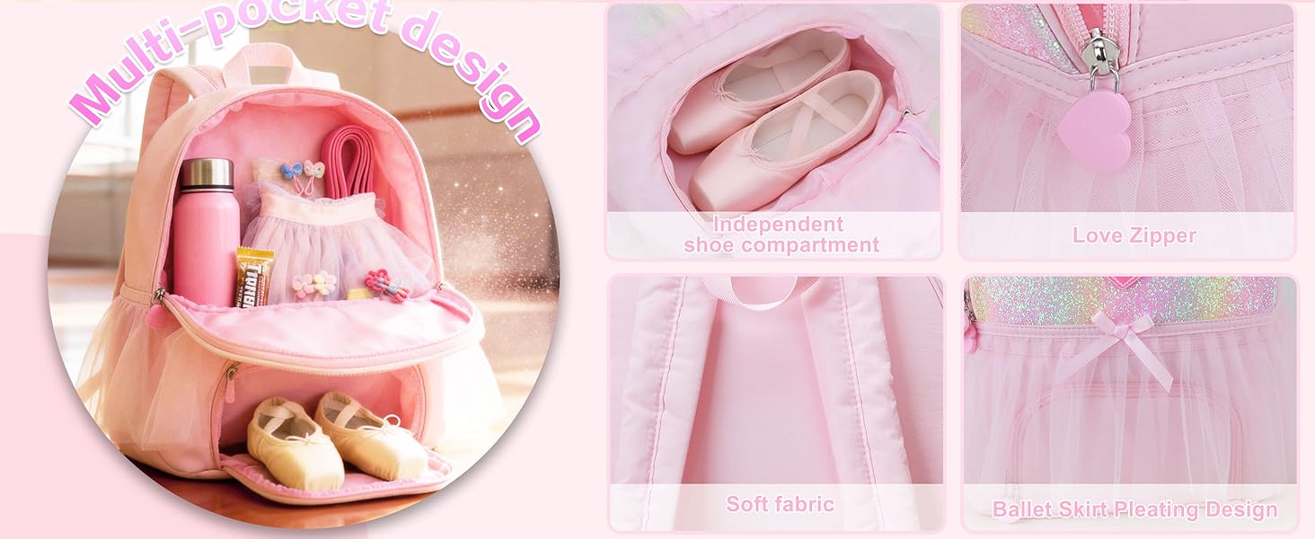 طراز ساحر مستوحى من الباليه - مزينة بفستان توتو وفيونكة، حقيبة الظهر هذه تجسد أناقة الباليه. مثالية لفصول الباليه أو المدرسة أو النزهات اليومية - مما يضيف لمسة من التألق إلى مغامراتها اليومية.