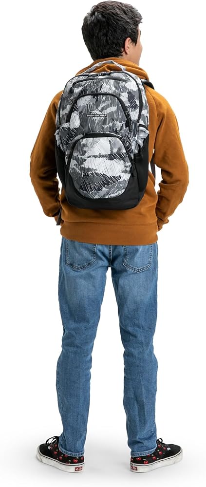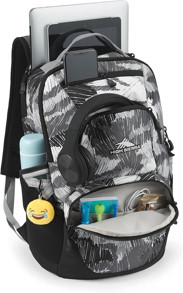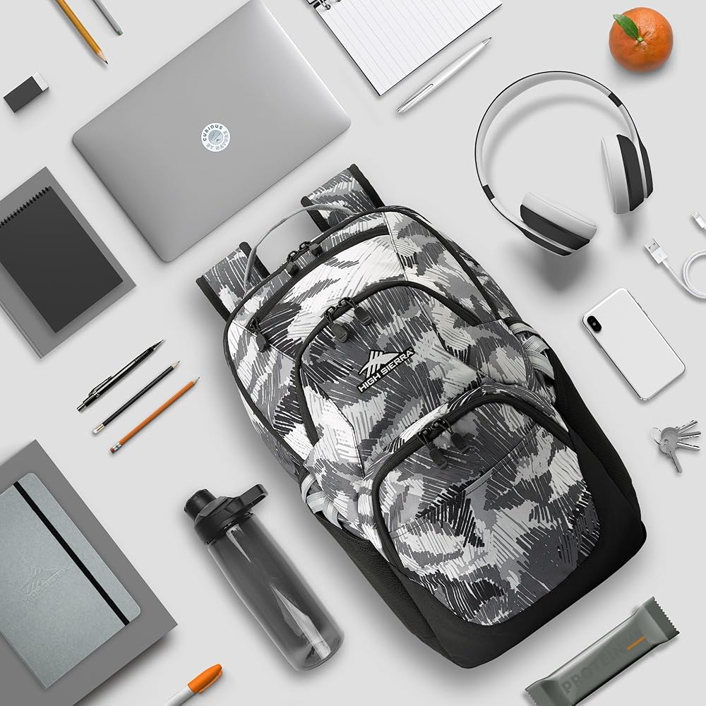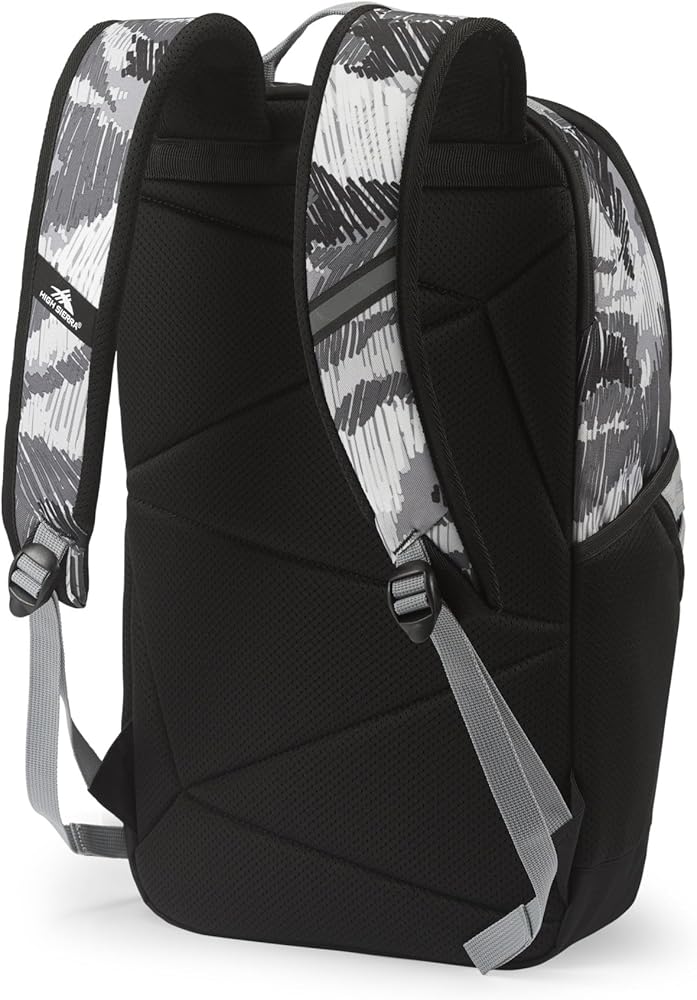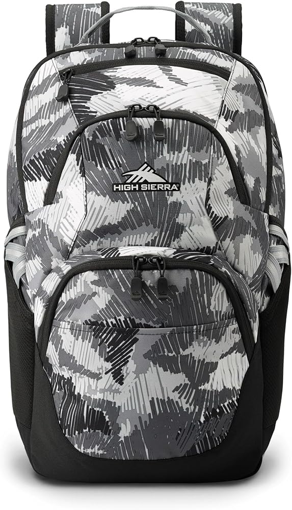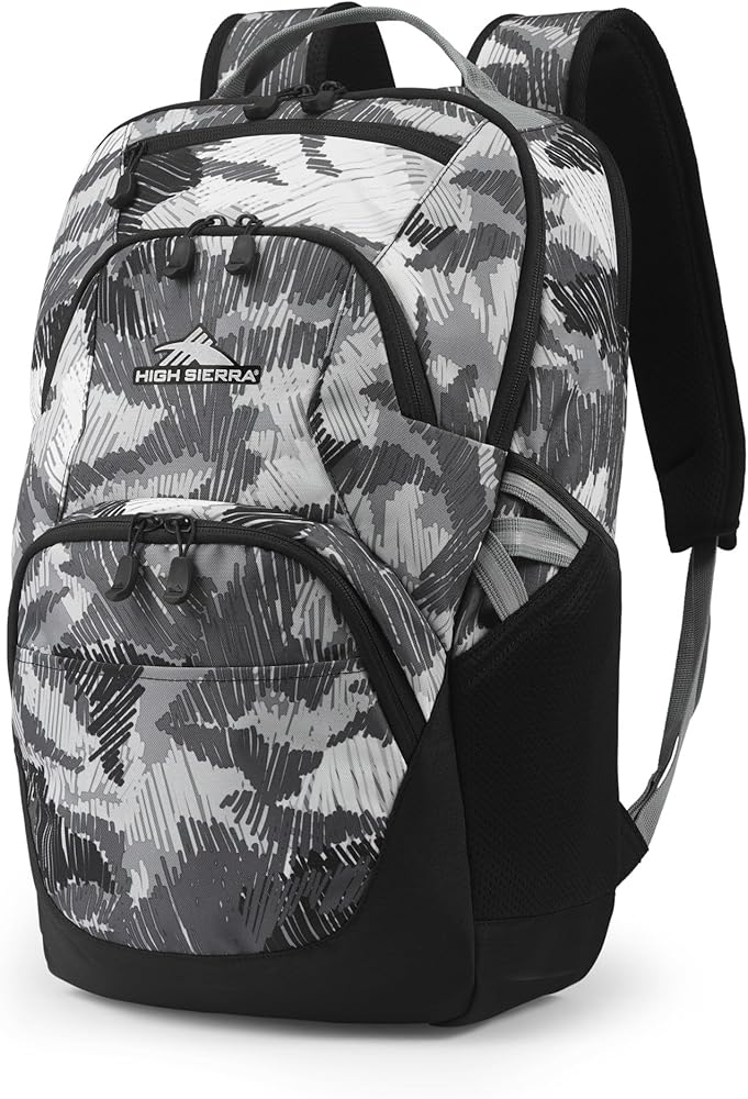 Look and feel stylish when you head to work, school or on a hike with the High Sierra Swoop Backpack. This 17" laptop backpack boasts a padded compartment that protects your device, along with padded straps for maximum carrying comfort. Foam-padded compartment holds most laptops up to 17". Water-resistant backpack is made from durable polyester. Reflective backpack helps you remain seen In low-light conditions. Laptop hammock offers bottom drop protection. Contoured, padded straps help to lighten your load. Straps and back panel boast air mesh for breathability. Business backpack with a large main compartment holds all the necessities. Cascading external accessory pockets hold items like pens, wallets and phones. Fleece-lined sunglasses pocket. Dual water bottle pockets help you stay hydrated. Camo design.
