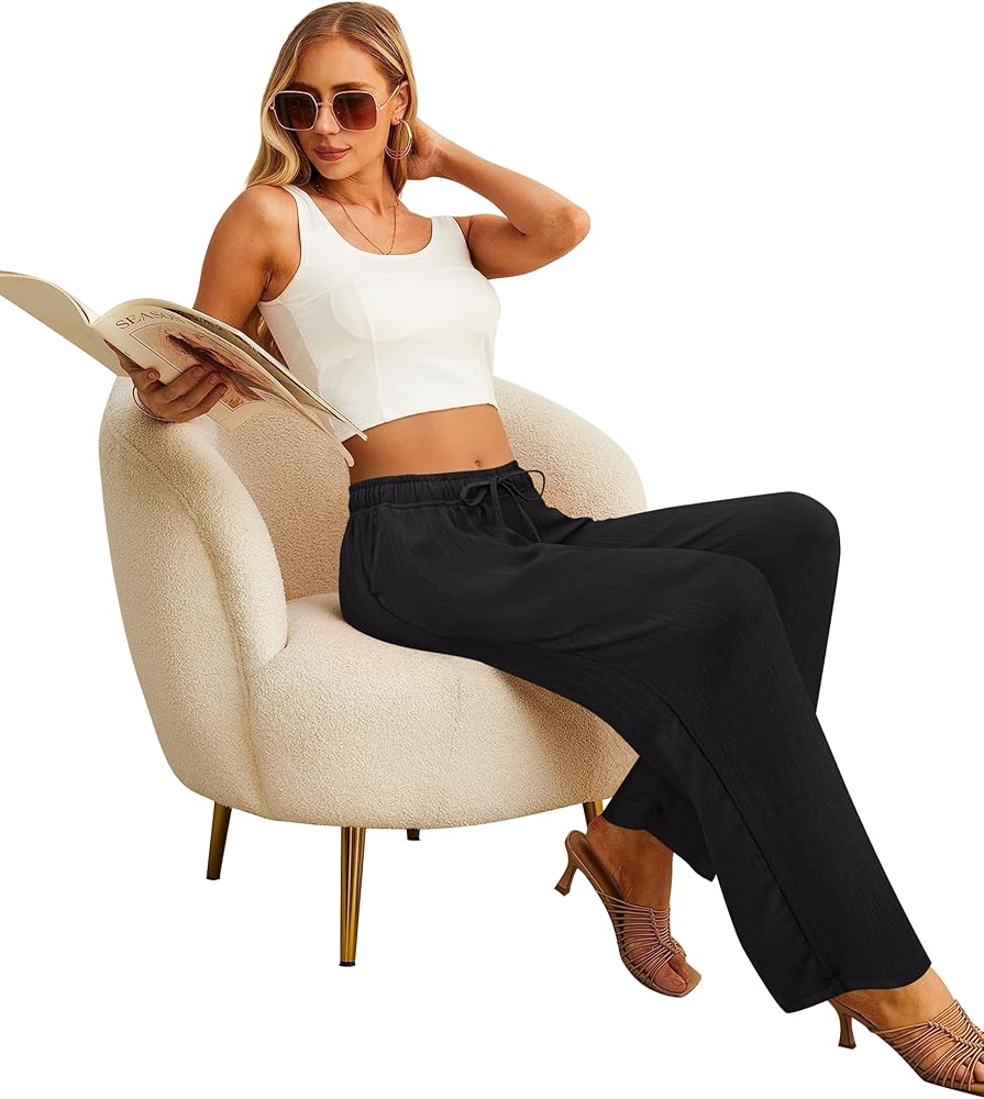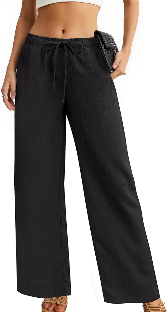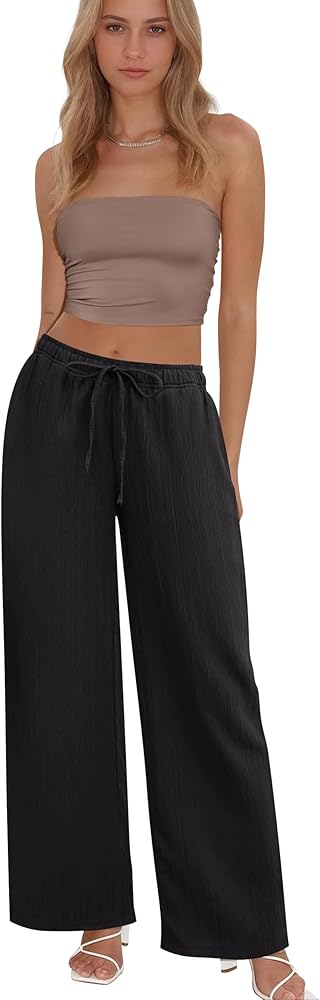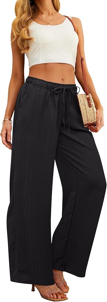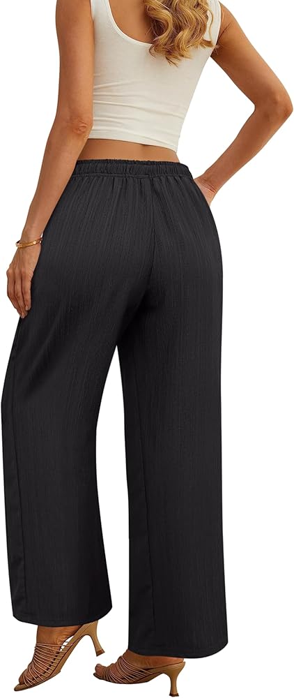 سروال بالازو نسائي واسع الساق أنيق غير رسمي صالة فضفاض بانت صيفي سفر فضفاض برباط خصر مرن بنطلون مع جيوب أسود XL